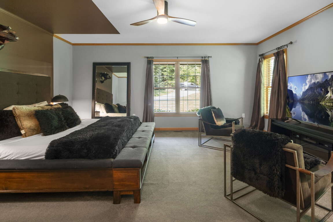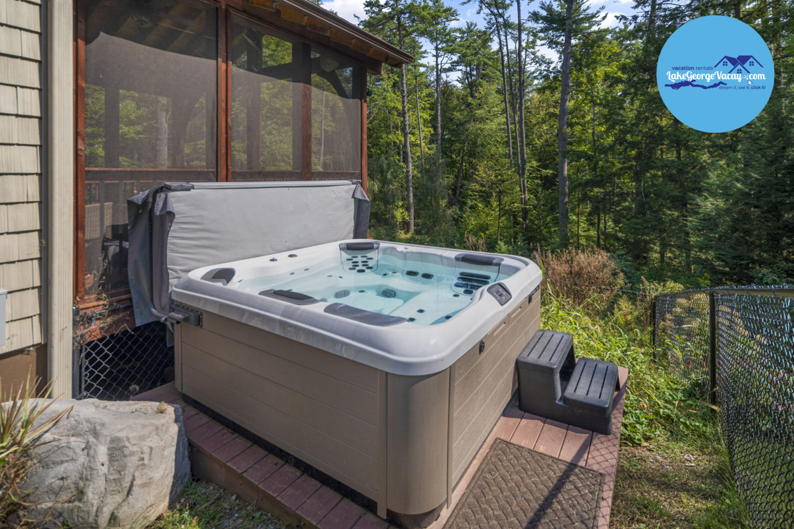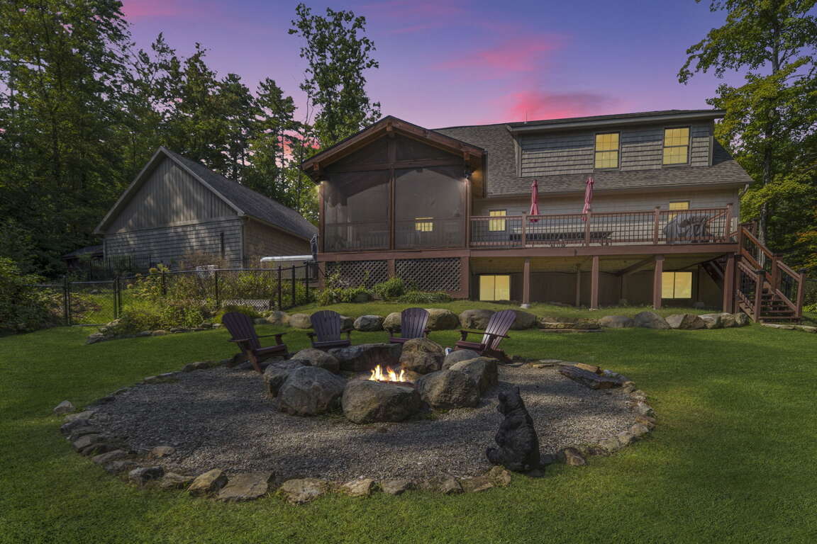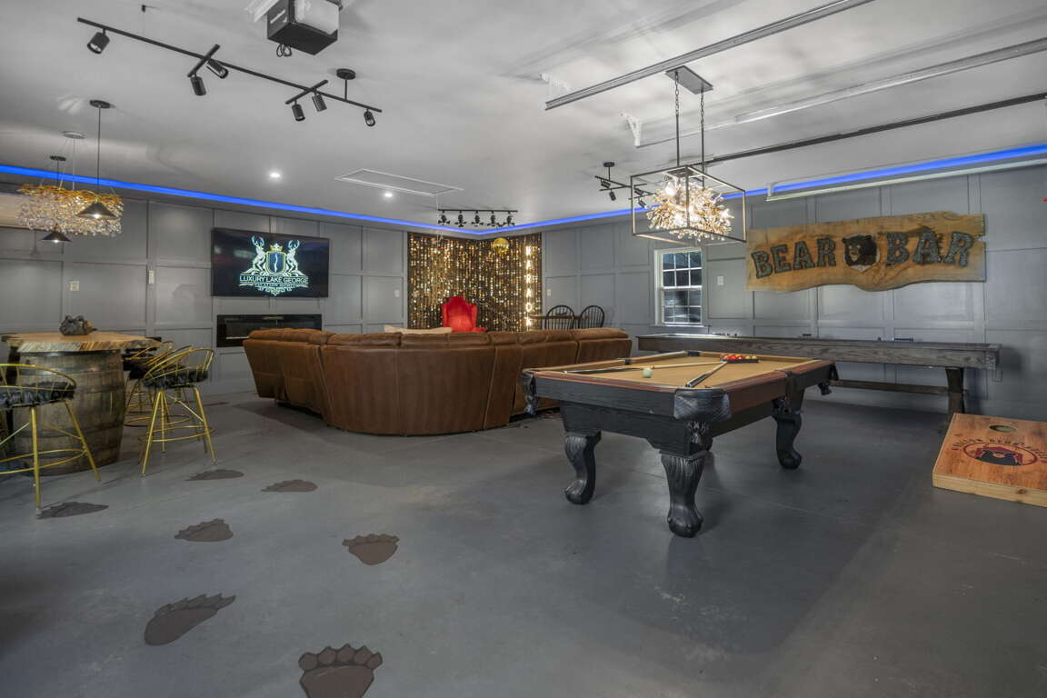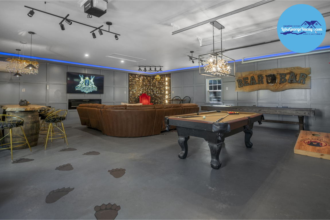 Bolton Landing's highlight, the Bolton Bear House, available for short-term rentals. 6 bedrooms, 3500 sq ft space, with top tier amenities such as a hot tub, fireplace, TV, and washer/dryer, provide a perfect vacation rental.