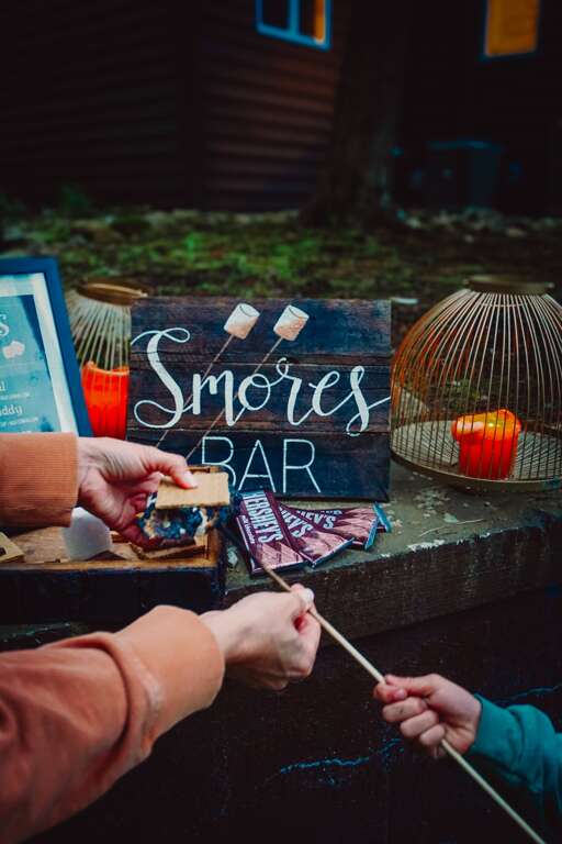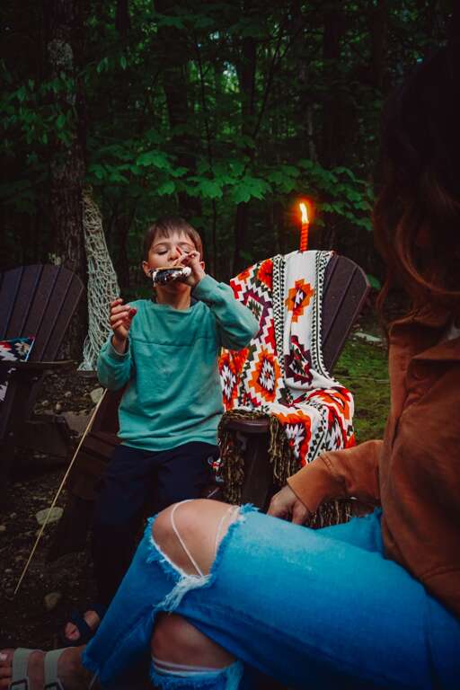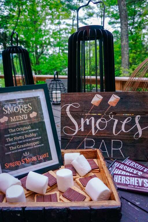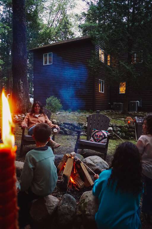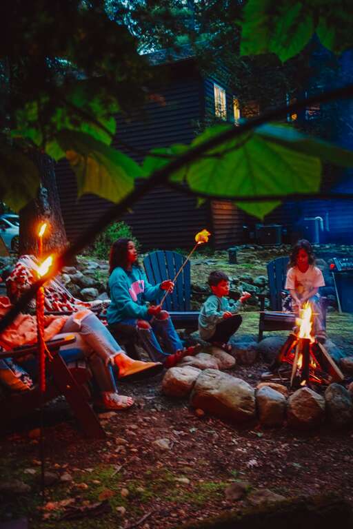 ⭑ Large stone fire pit with Adirondack chairs, ideal for toasting S'mores