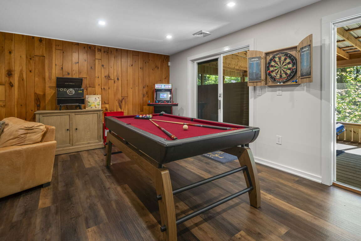 ⭑ Game Room with Mrs. Pac Man, NBA Jam, pool table, and dart board ️