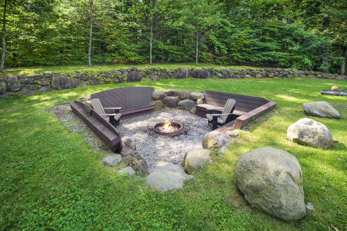 ⭑ Large stone fire pit with Adirondack chairs, ideal for toasting S'mores
