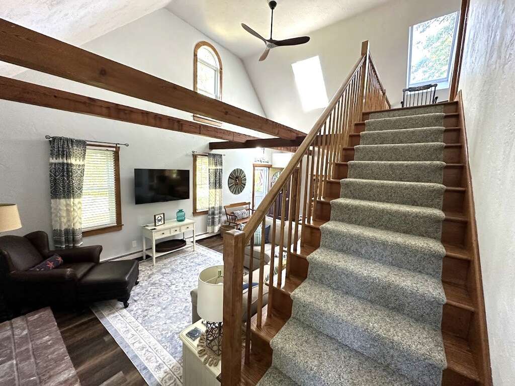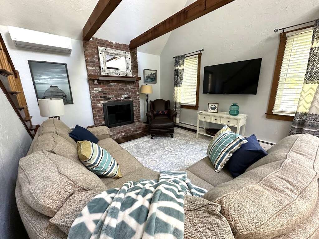 Each bedroom features its own window A/C unit, while the living room includes a ductless air handler to keep the home cool. The first floor offers a bedroom with two twin beds, a shared full bath with shower, a well-equipped kitchen, dining area, and cozy living room with sliders leading to the deck. Upstairs, the loft bedroom includes a queen bed and en-suite bath with a shower/tub combo. The lower level provides an additional queen bedroom and an adjoining “tavern-style” lounge with a bar, TV, and seating area—plus walkout access to the lower level patio & yard.<br />
