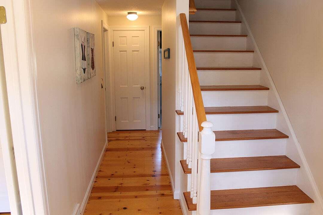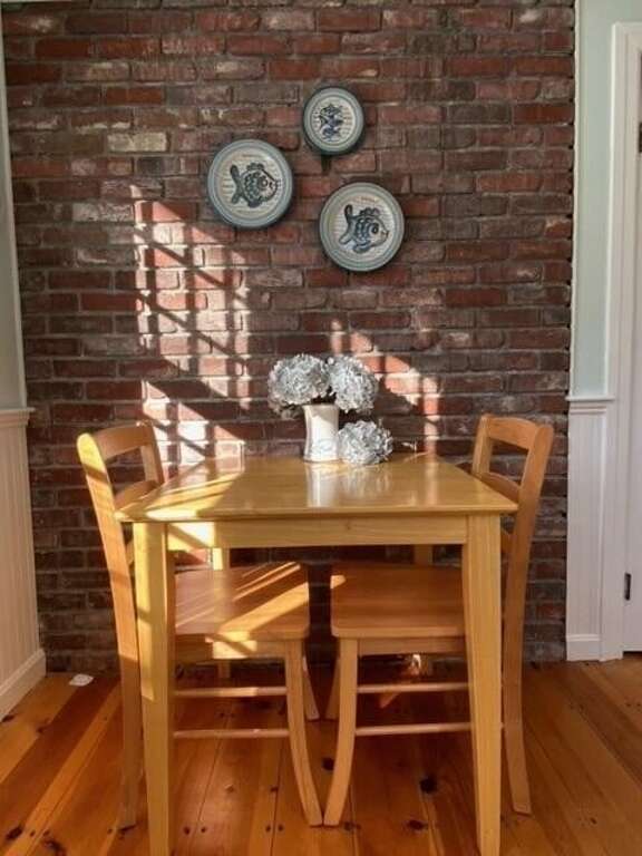 The first floor features a bright, open living room with a 50" Smart TV and Sonos Sound System, leading to the dining area with a large picture window overlooking the back deck. The fully renovated kitchen includes additional seating and an exposed brick accent wall.<br />