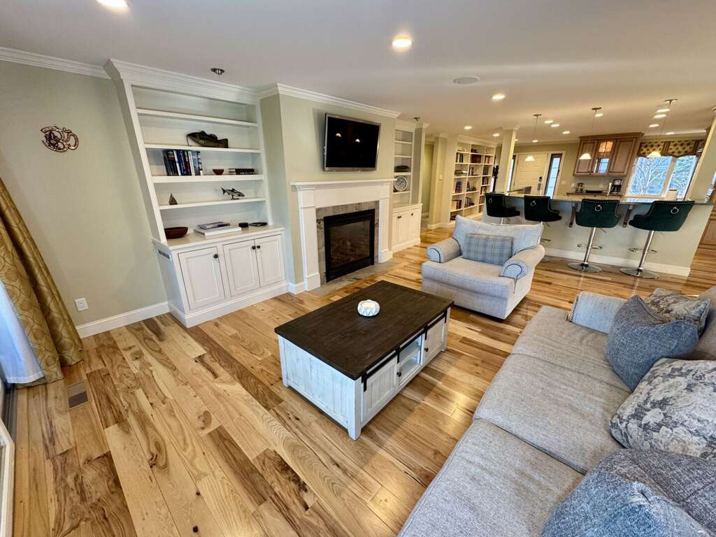 The spacious living room with built-ins and a large dining area opens to a screened porch all providing magnificent bay views. <br />