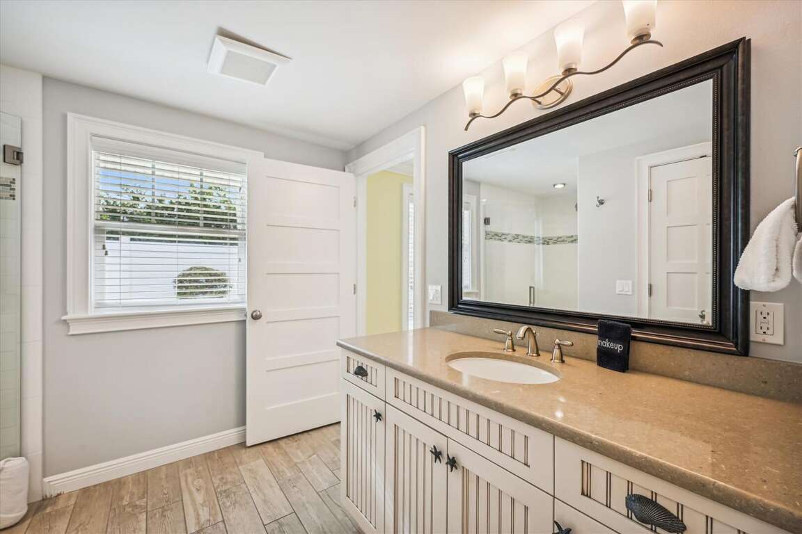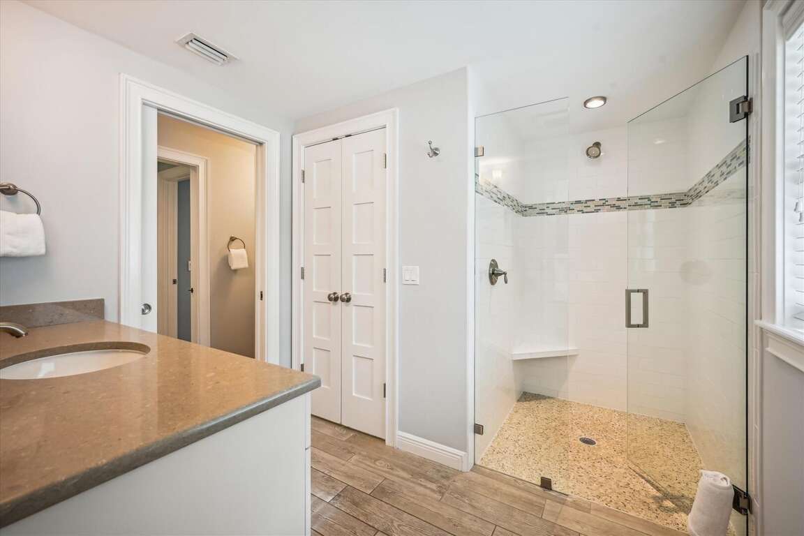 The Castaway Cottage offers two master bedrooms and two full bathrooms, providing comfortable accommodations for up to four people. Each bedroom is tastefully decorated with a charming coastal theme, creating a relaxing and inviting atmosphere. Guests will enjoy the cozy king size beds, adorned with luxurious 600 thread count prima cotton wrinkle-free sheets. The bedrooms also feature ample storage space for belongings, ensuring a clutter-free environment during your stay. In addition to the bedrooms, the cottage boasts two full bathrooms equipped with all the necessary essentials. Guests will find fresh linens, towels, and beach towels provided, ensuring a comfortable and convenient experience. Whether you're getting ready for a day at the beach or unwinding after a long day of exploring, the bathrooms at Castaway Cottage have everything you need.