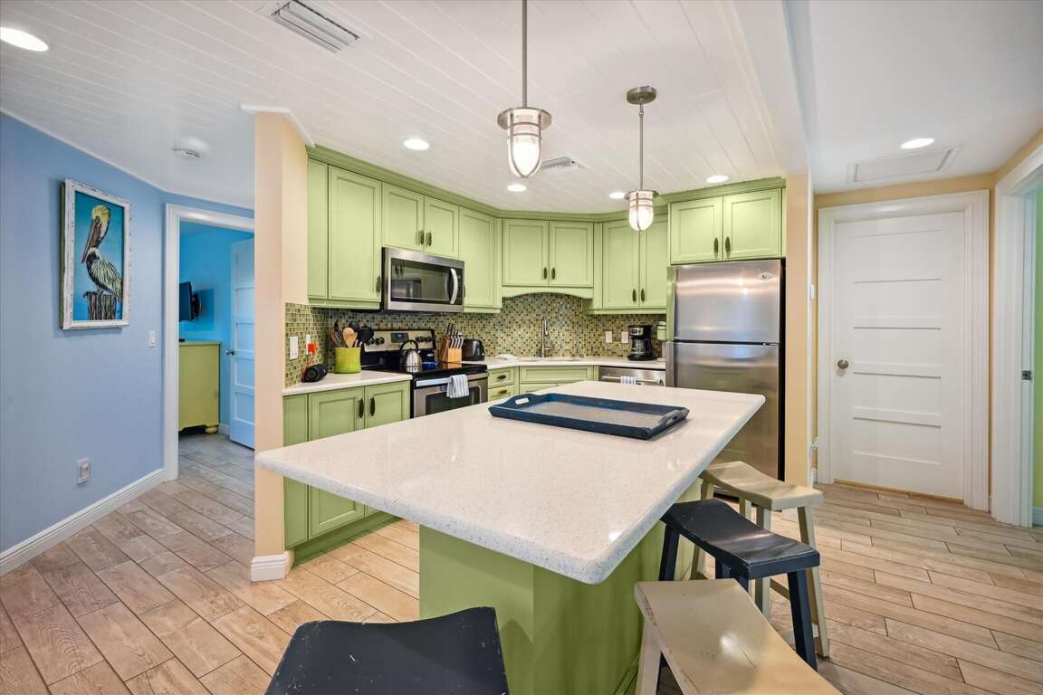 The kitchen in the Surf Camp Cottage is fully equipped to meet all of guests' culinary needs during their stay. Here are some of the features and amenities that make this kitchen a perfect space for cooking and dining: