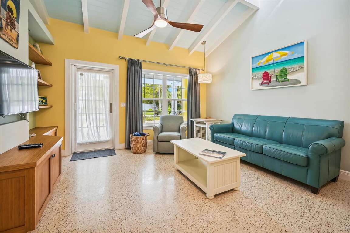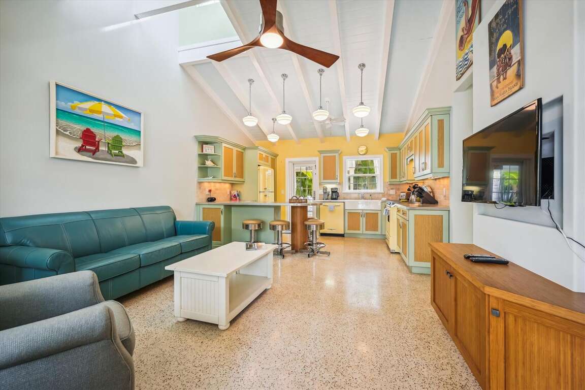 The fully equipped retro style kitchen in this vacation rental in Holmes Beach, FL offers all the amenities needed for a memorable dining experience. With its charming and nostalgic design, the retro kitchen adds a touch of vintage flair to your vacation. The kitchen is stocked with all the essential appliances and utensils, allowing you to prepare your favorite meals with ease. The open layout of the kitchen and dining area setup creates a seamless flow for easy entertaining. The bar seating for four provides a cozy spot to enjoy your meals, while the spacious living area allows for relaxation and socializing. Linens, towels, and beach towels are included, ensuring a comfortable stay. Additional linens are also available upon request. Stay at Flop Cottage and enjoy the convenience and charm of its retro kitchen and dining area.