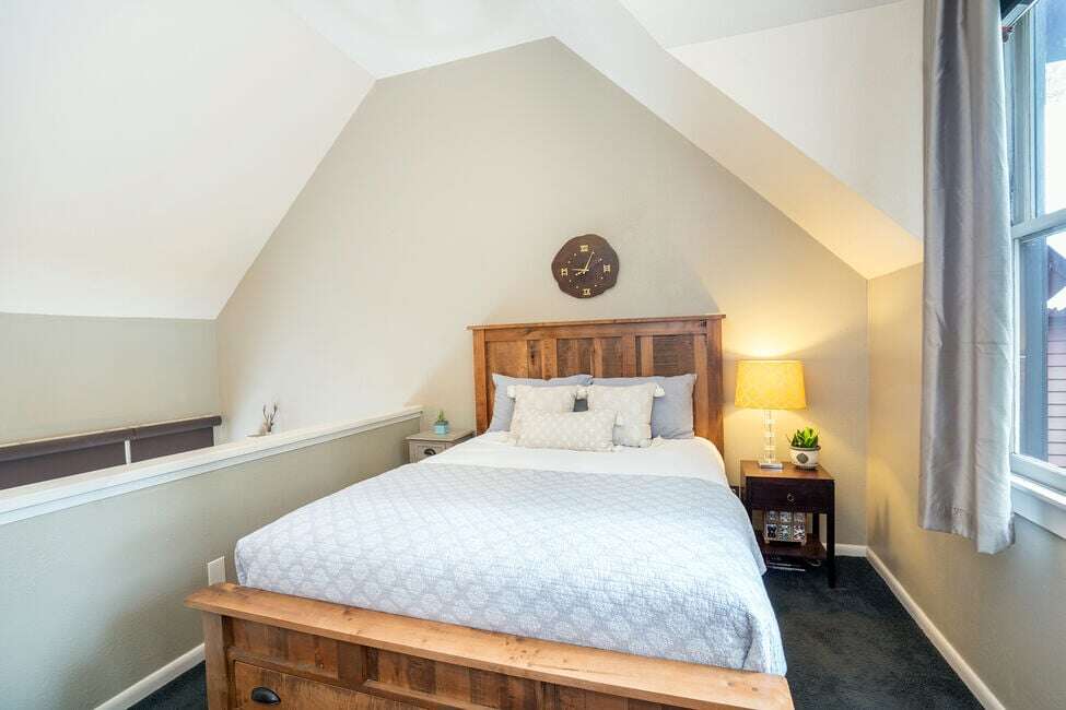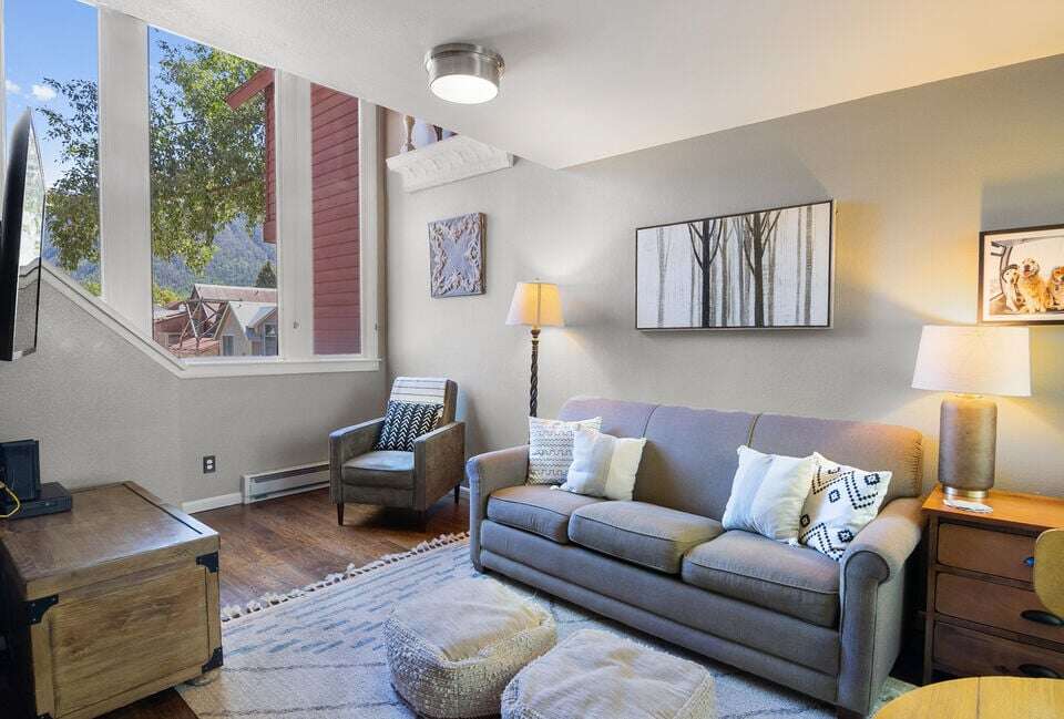Located alongside Cornet Creek at 103 S Davis St, the Luxurious Cornet Creek 102 Condo presents a sophisticated 1-bedroom retreat that accommodates up to 4 guests. The interior design of the condo blends modern elegance with a cozy ambiance, offering a fully equipped kitchen, a spacious living area with a large flat-screen TV, and a comfortable queen-size bed in the bedroom. Guests can enjoy the stunning views of the surrounding landscape from the private deck overlooking Cornet Creek, providing a serene backdrop for relaxation. The natural light filtering through the windows enhances the industrial flair of the décor, creating a peaceful environment ideal for unwinding after a day of exploring Telluride's attractions.