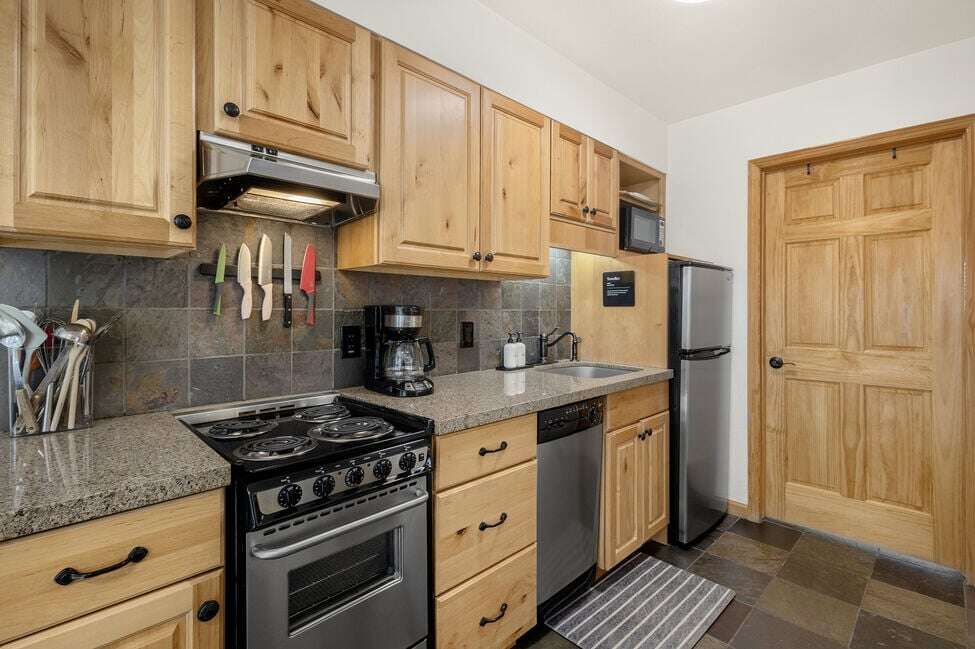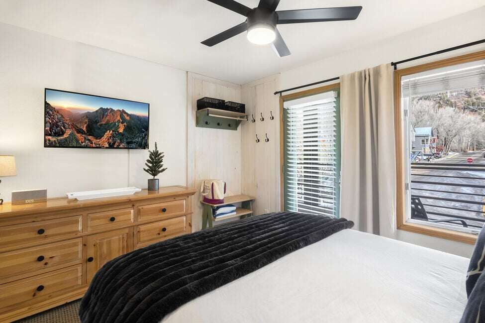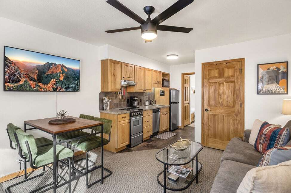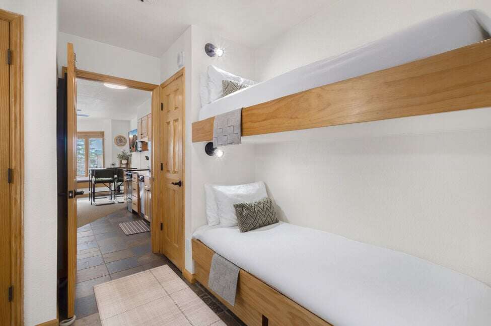 Your stay at Viking Lodge 217 offers a cozy and modern retreat with 1 bedroom, sleeping accommodations for up to 5 guests, and a full bathroom, creating a comfortable and scenic setting for your Telluride getaway. The room features a modern, cabin-like feel with bunk beds for kids, perfect for a family-friendly vacation. The decor is charming and welcoming, with a touch of rustic elegance. In addition to the comfortable sleeping arrangements, the 500 sqft. living space includes a large bay window offering stunning views of the river and mountains. For added convenience, there is a full-size kitchen with modern appliances and a sleeper sofa in the living room. The sliding doors allow for privacy between sleeping areas, making it ideal for families or groups.