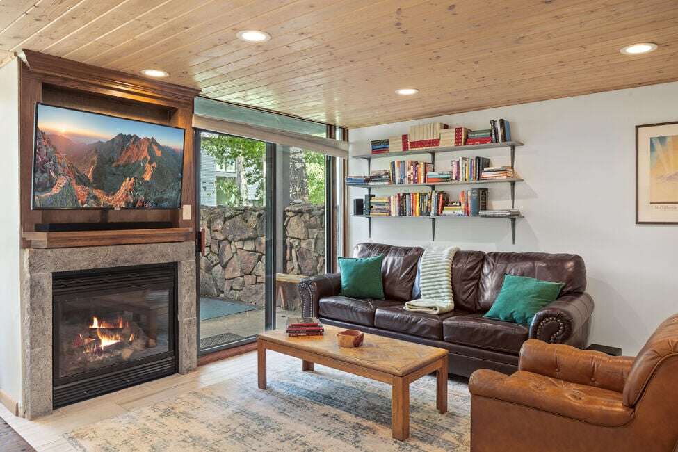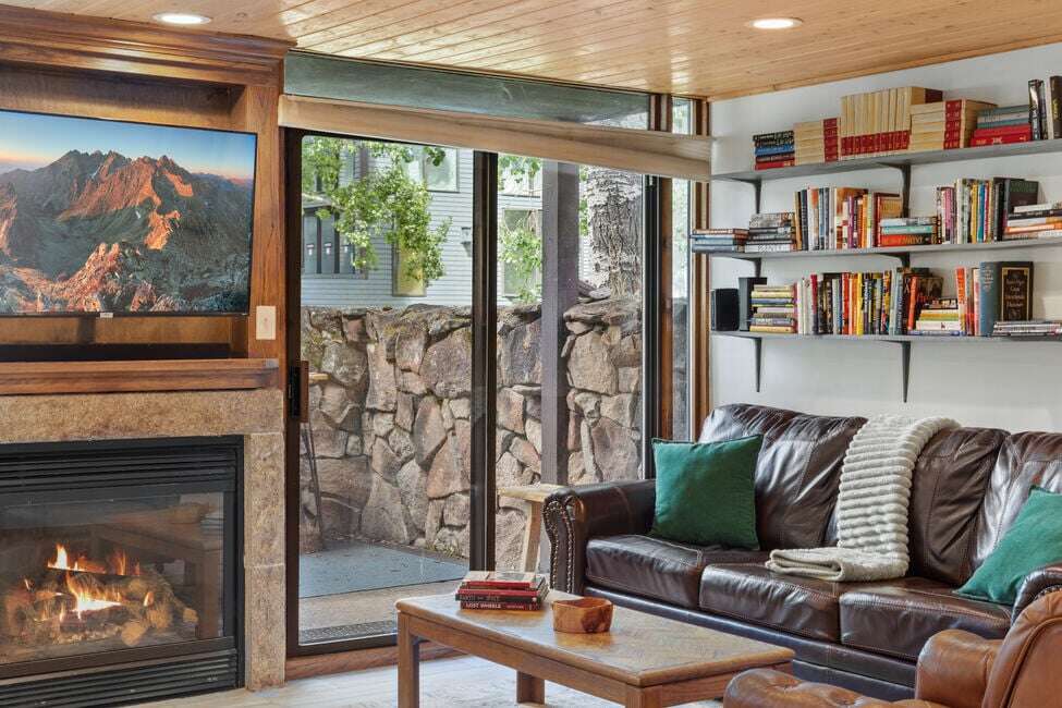This functional, comfortable studio on the ground floor features a queen bed and a pull-out queen sleeper sofa, making it ideal for couples, solo travelers, or small families. Enjoy the warmth of a gas fireplace, a full kitchen for home-cooked meals, and a dining area with room to gather. Step outside to your private patio, where you can enjoy the mountain air and relax while taking in the mountain views. <br />