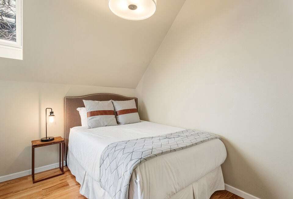 • Guest Bedroom: Queen bed, cozy reading nook, bright windows above, and generous storage<br />