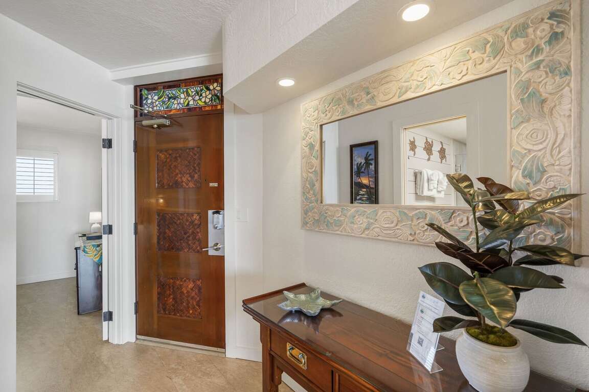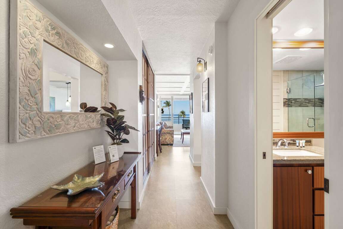 The unit’s exceptional features begin at the entrance with a beautifully crafted tile and mosaic entryway. Inside, the tropical finishes and décor immediately evoke the Maui vibe. Hand-selected furnishings from Maui’s top showrooms provide comfort and style, blending soft tropical tones with custom wood accents for an intoxicating effect.