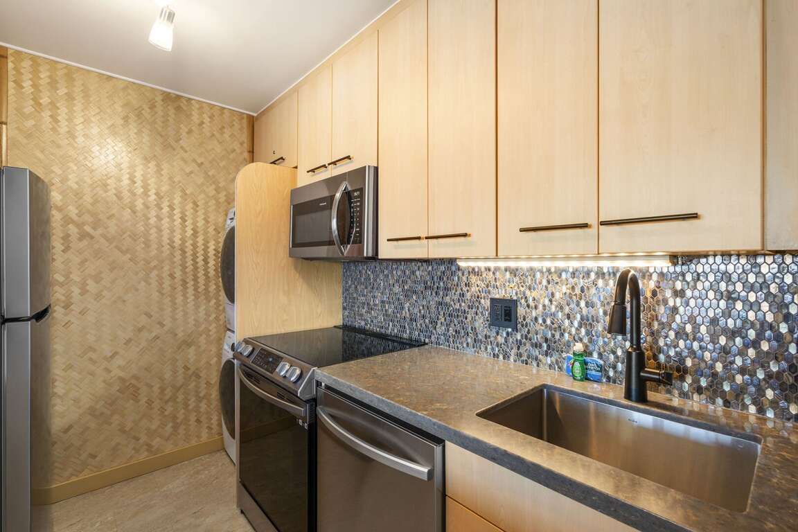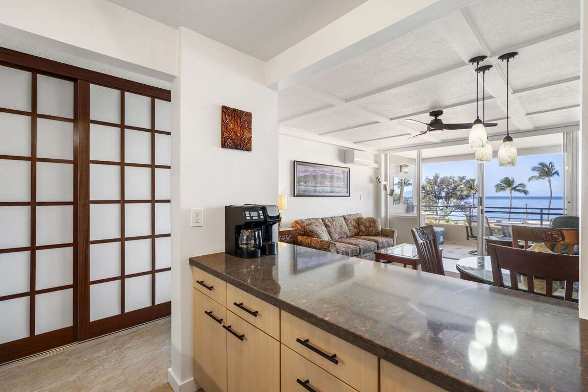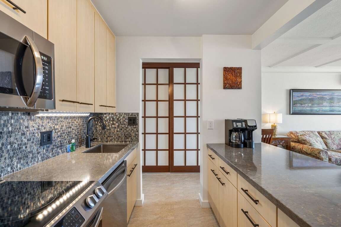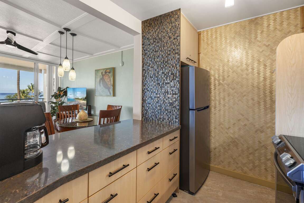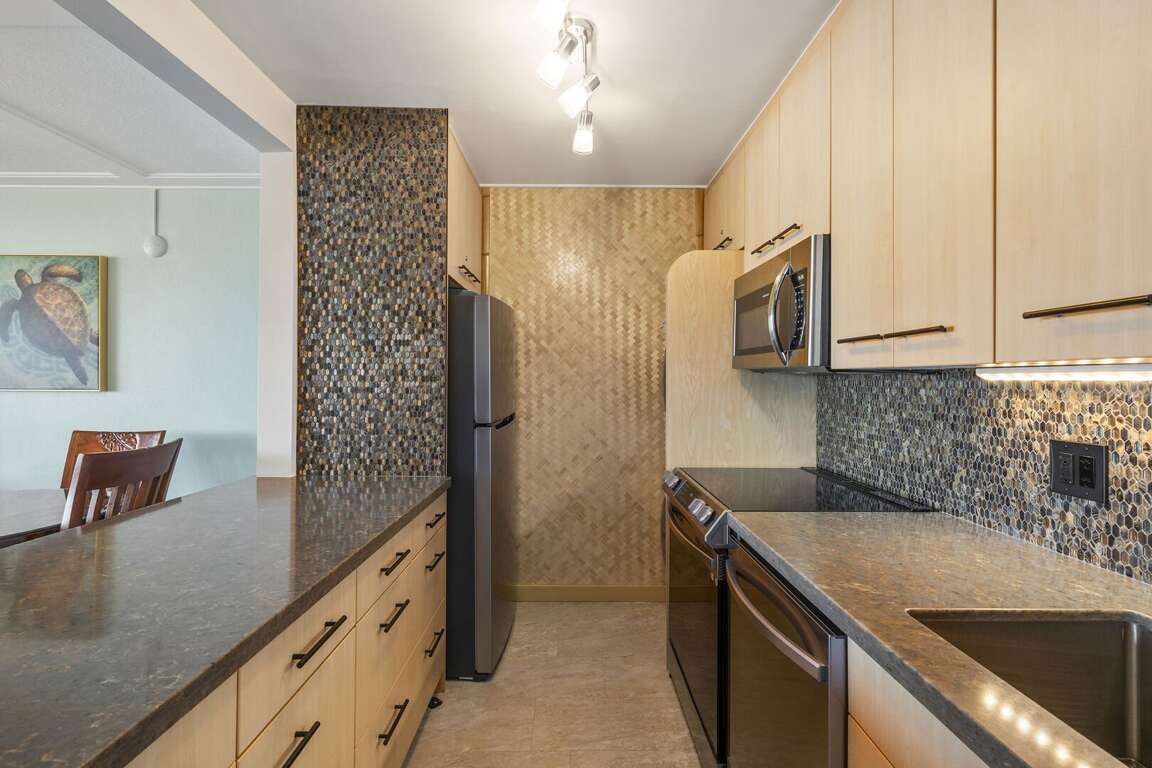 Experience the true essence of Aloha in this completely remodeled South Maui hideaway. Kamaole Beach Royale 405 now boasts split AC with thermostatically controlled air handlers in both the bedroom and living room, a brand-new kitchen with stainless steel appliances. Enjoy hard surfaces throughout with beautiful tile workmanship throughout the unit. All set against a backdrop of stunning blue water views that invite you to the beach just minutes away.
