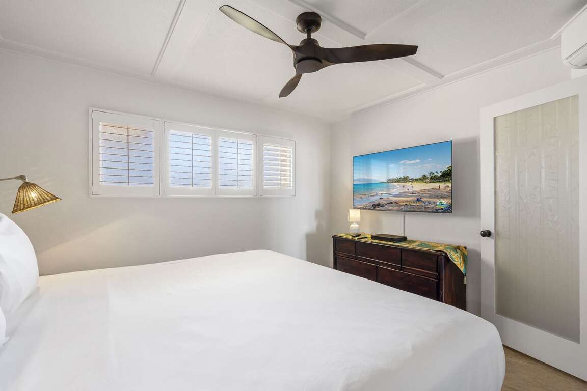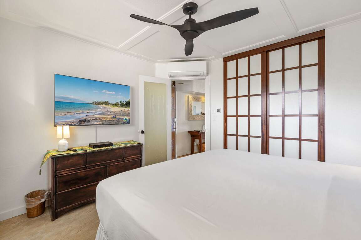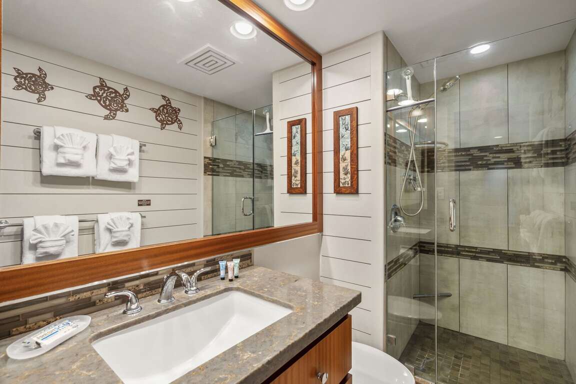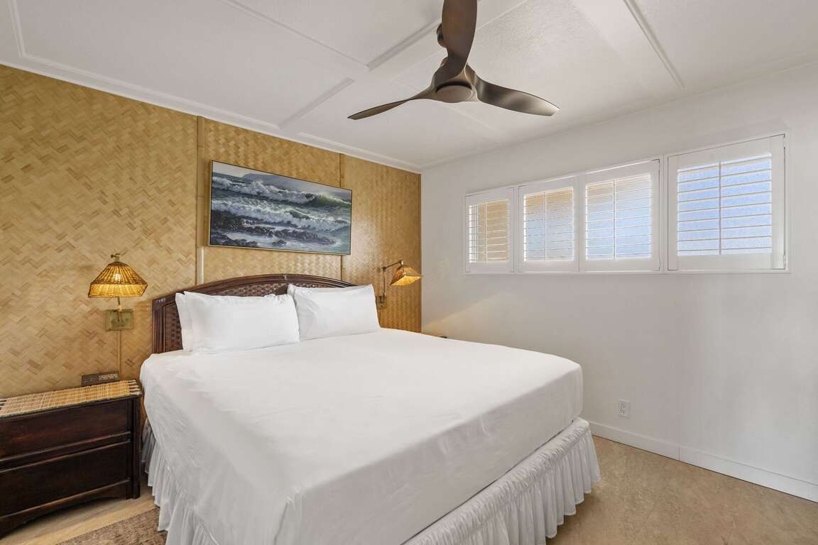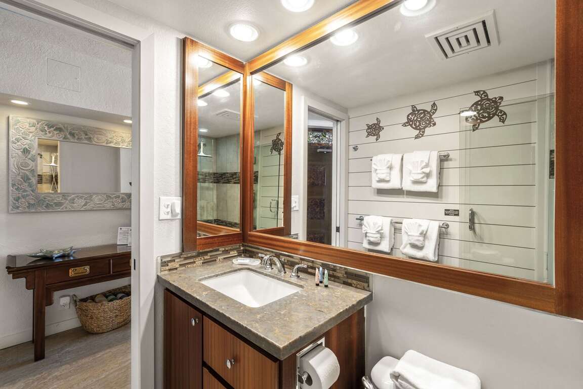 Rest in the comfort of a king bed with luxury linens, ensuring you're recharged for the next day's adventures. The unit also includes high-speed wireless internet, a large living room TV, a wall-mounted bedroom TV, and free parking near the elevator. Split AC and ceiling fans, alongside the ocean’s tropical breezes, keep the unit cool and comfortable. The bathroom showcases a recent remodel with granite surfaces and a glass tile backsplash, enhancing its luxurious feel.