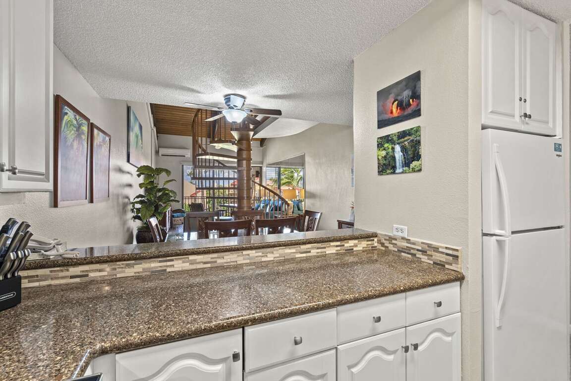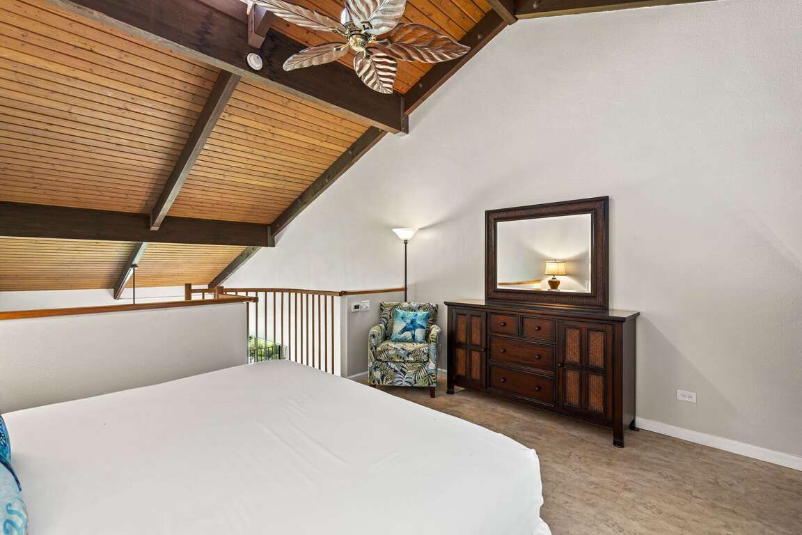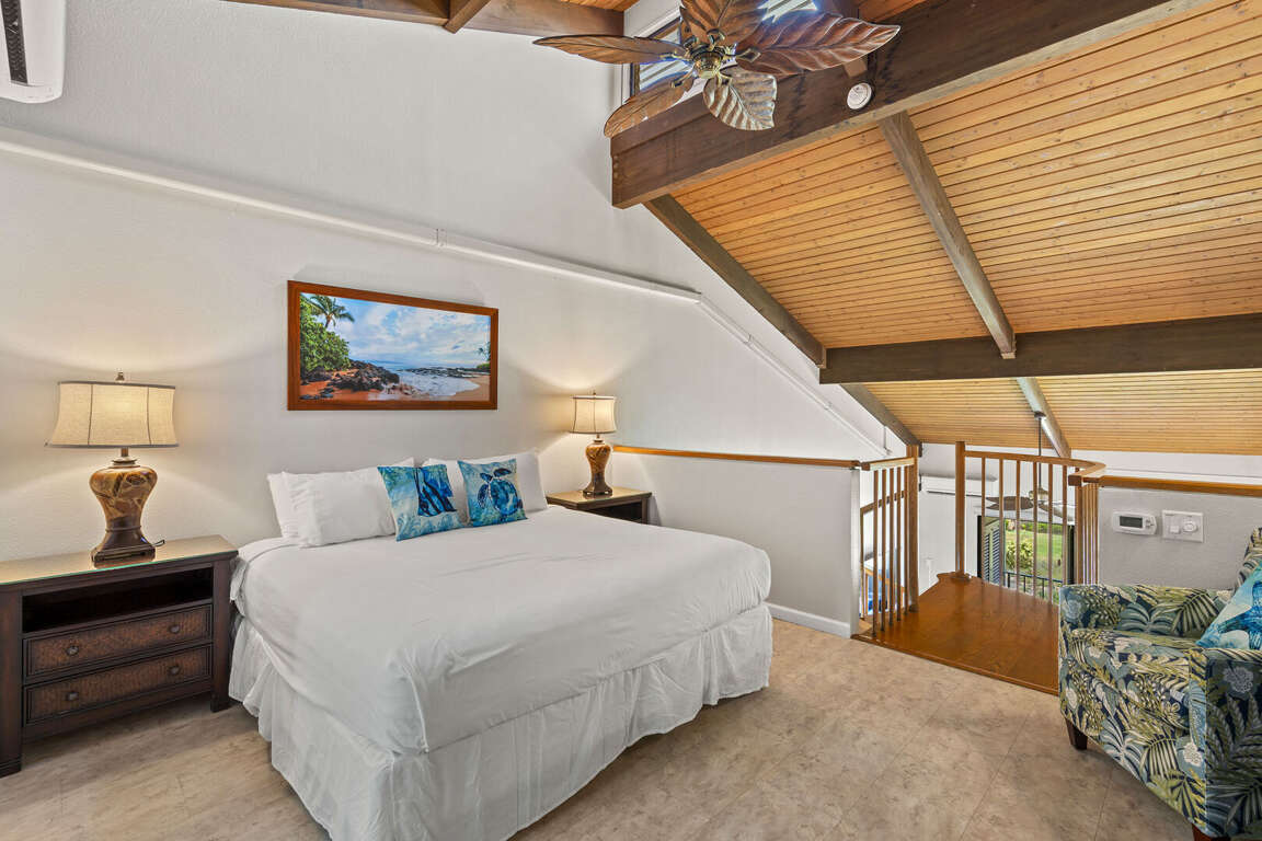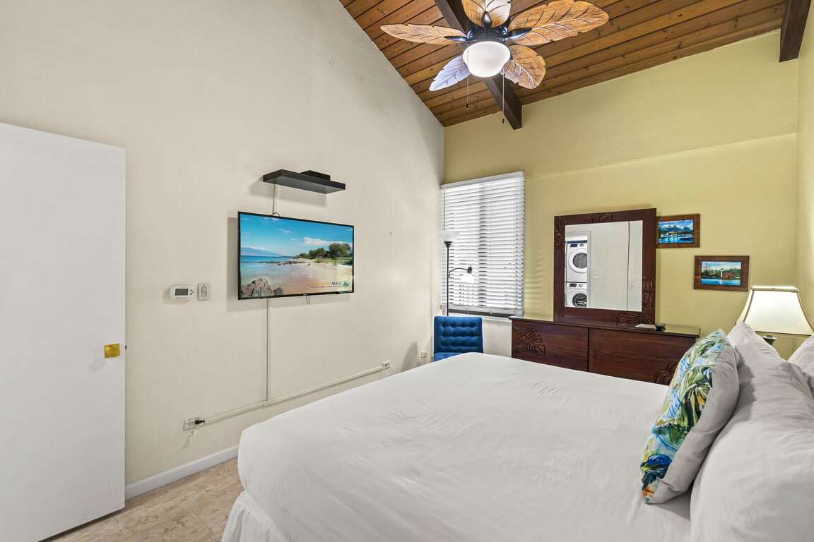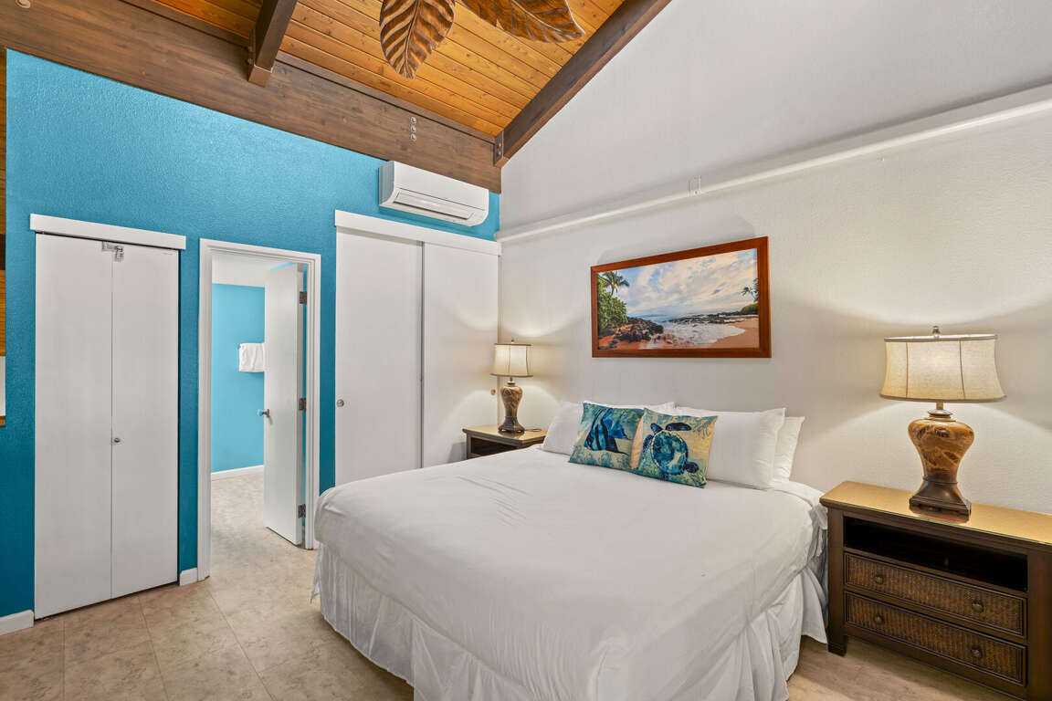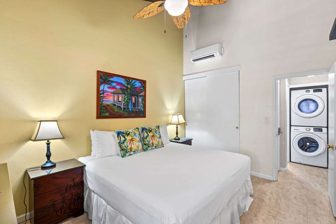 Inside, you’ll find an open‑concept living area with vaulted ceilings, stylish tile flooring, and tri‑zone split air‑conditioning to keep every room cool. The living room includes a queen sleeper sofa for extra guests, while large sliding doors lead to the private lanai - perfect for morning coffee or evening cocktails with lush garden views.
