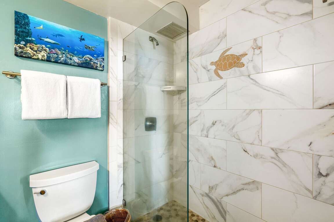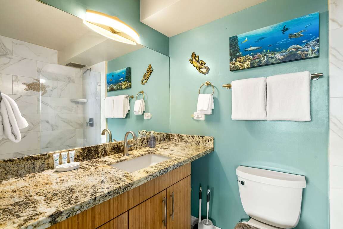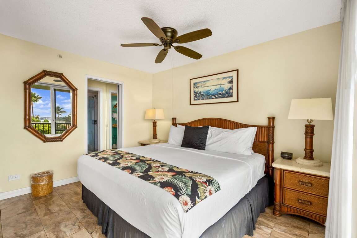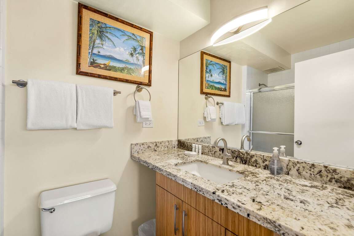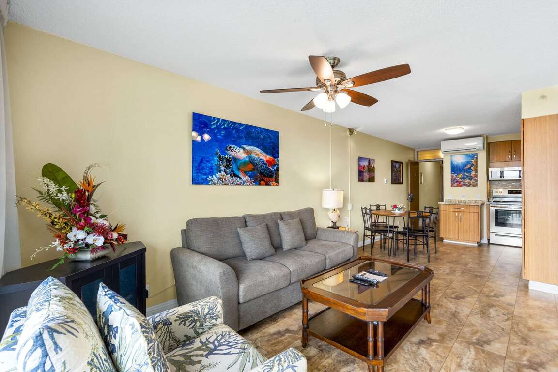 Sleep the sound of the waves and experience one of the island's best ocean views from your living room and lanai. Tropical breezes waft through the condo with your open lanai door or relax in air-conditioned comfort throughout the unit.