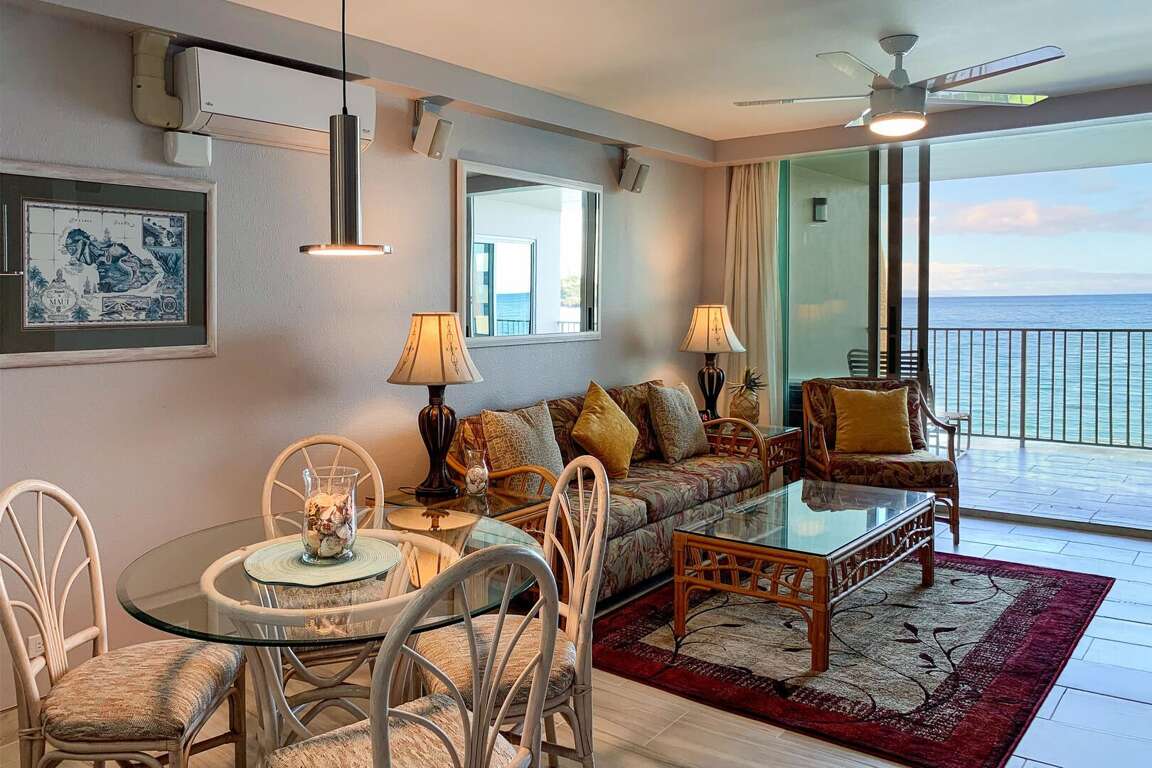 Icing on the cake: the Royal Mauian’s private penthouse barbecue and viewing deck, with arguably the best views of the Kihei shoreline, outside a helicopter. Gas grills, a fridge, table, and sink are open to guests of this unit, and it’s an amazing place to wind down your day over beverages. There’s also a beautiful sunning lawn out front, and an ocean front pool for guest use.