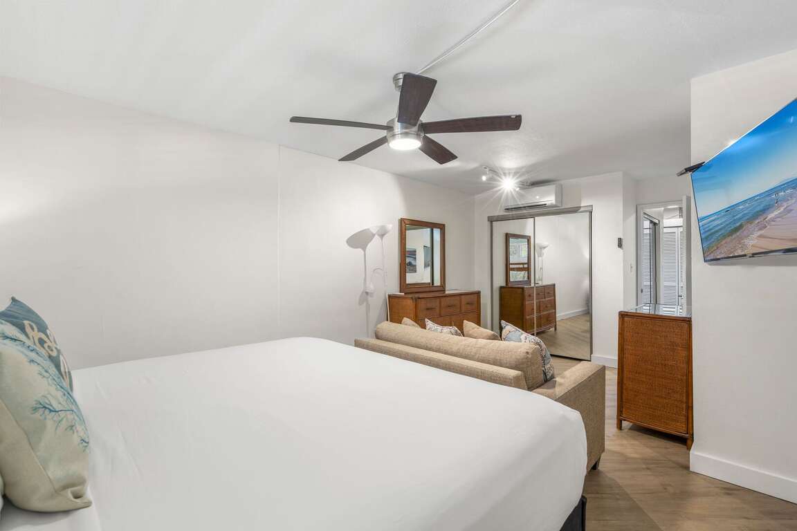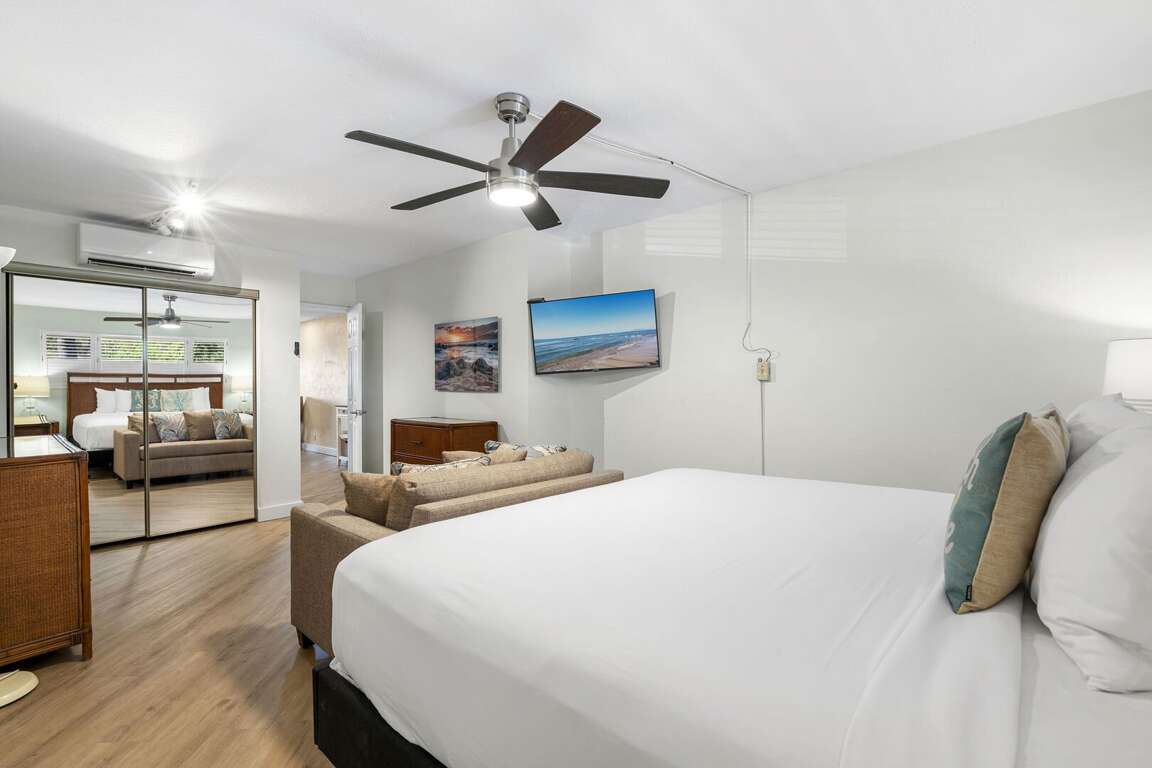 Comfort and flexibility define the sleeping arrangements: the spacious bedroom features a king‑size bed as well as a twin sleeper sofa, while the living area includes a queen size sofa sleeper, making the unit capable of comfortably accommodating up to four guests. Split‑system air conditioning ensures a cool, comfortable stay after a day of sun and surf.