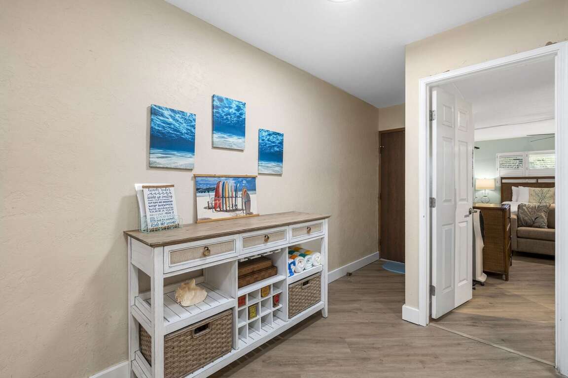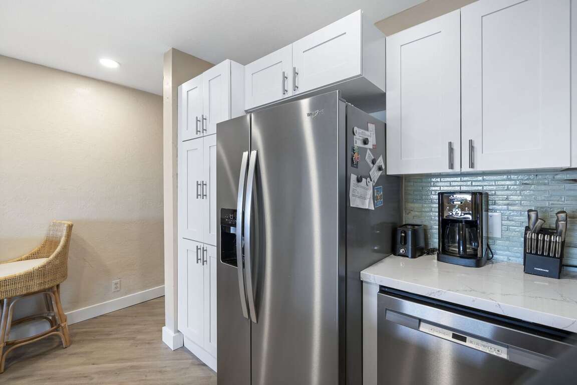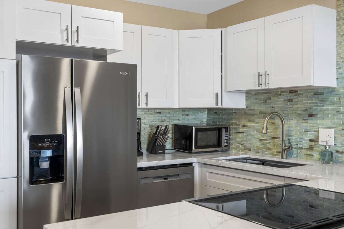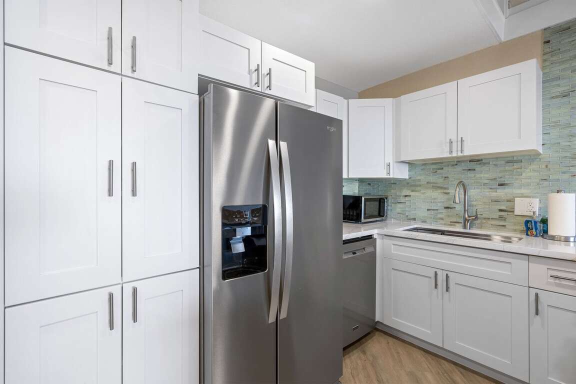 Inside, the full renovation includes a brand‑new kitchen with sleek cabinetry and stainless-steel appliances, complemented by fresh flooring throughout and contemporary, beach‑inspired furnishings that give the space a light, airy feel. The updated bathroom and thoughtful finishing touches make the condo feel like a modern coastal retreat.
