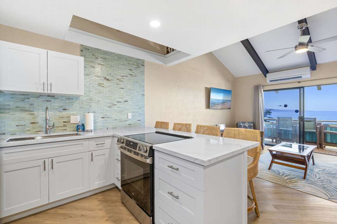 Fresh from a top-to-bottom renovation, Shores of Maui 215 is a beautifully updated one‑bedroom, one‑bath condo that blends modern design with relaxed island living. Perched on the top floor of the charming garden‑style complex, the unit showcases sweeping ocean views from its private lanai - ideal for enjoying your morning coffee or watching surfers at Cove Park as the sun dips below the Pacific.