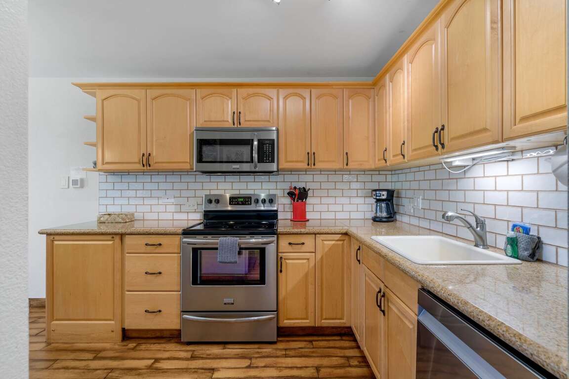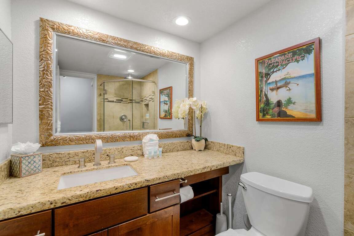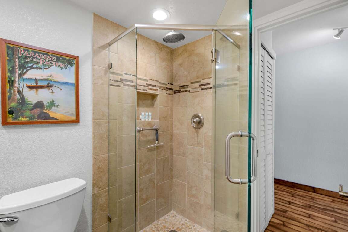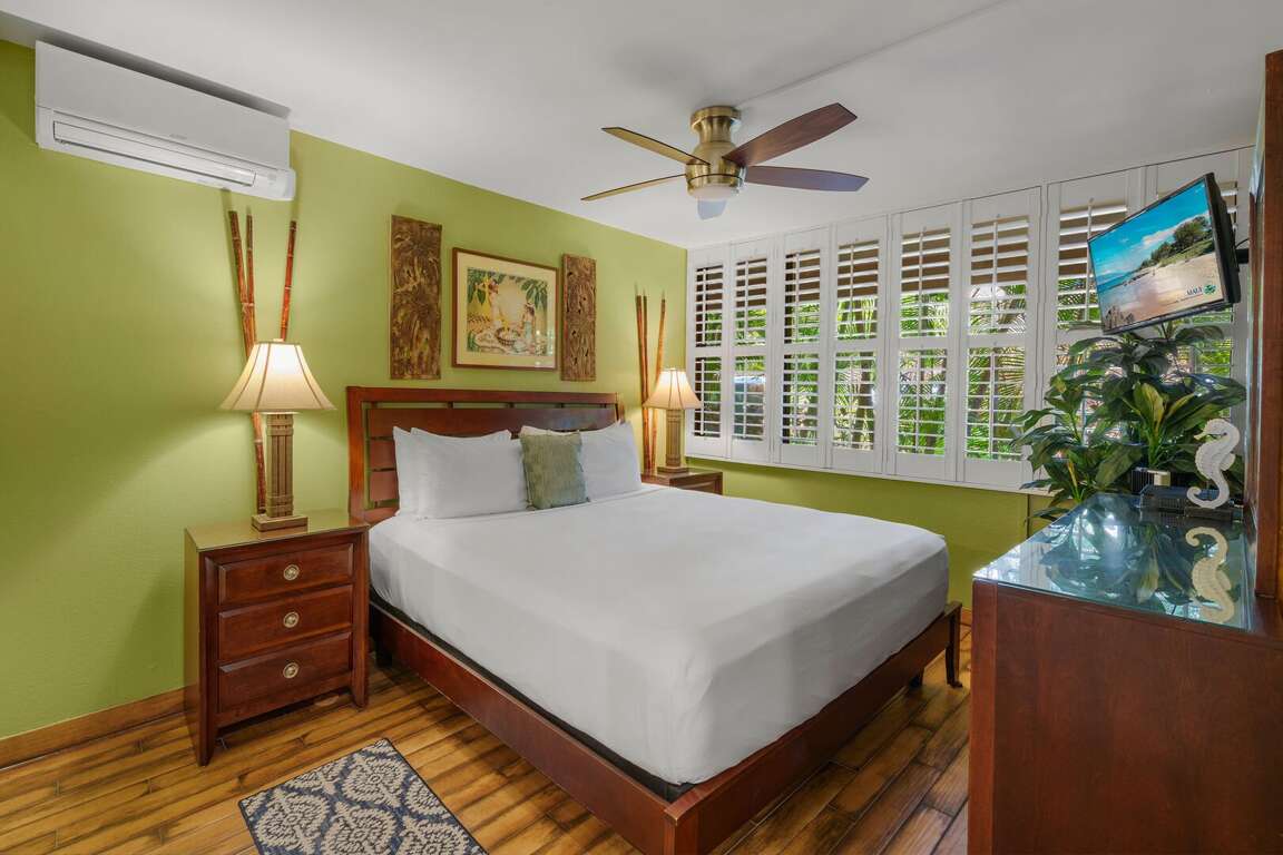 Your spacious bedroom is a private haven, featuring a plush king bed, cable TV, and its own split A/C unit to keep you cool and comfortable. With two full bathrooms, this condo offers added convenience and flexibility, ensuring your stay is as relaxed and carefree as possible.