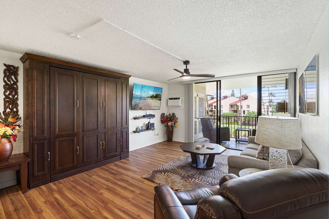Relax in cool, quiet comfort with all-new, whisper-quiet air conditioning in every room - perfect for restful nights and sunny afternoons. The open-concept living area features all-new furniture, a smart TV for streaming, and a custom queen-size Murphy bed - far superior to a typical sofa sleeper, offering a true mattress and solid support for extra guests without sacrificing space or style.