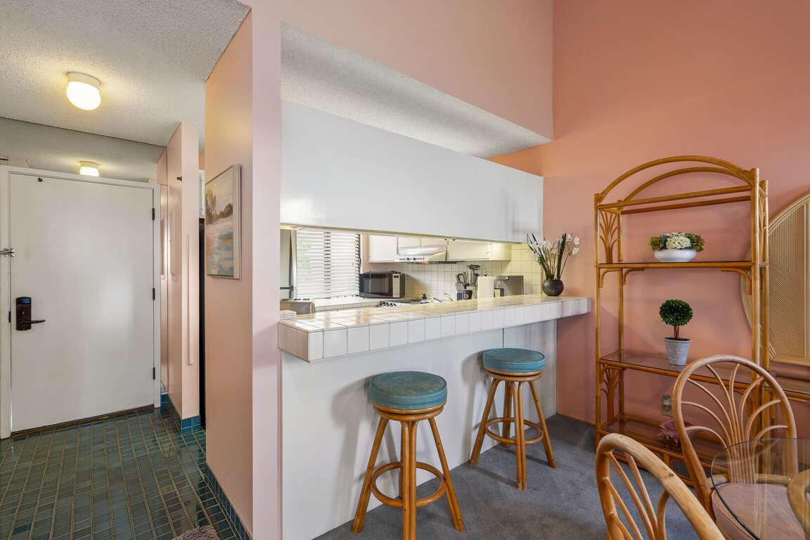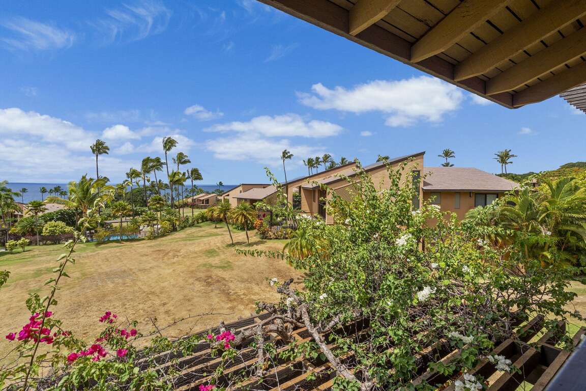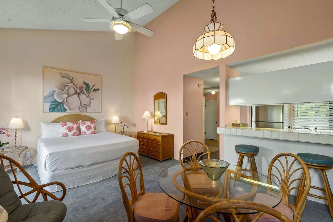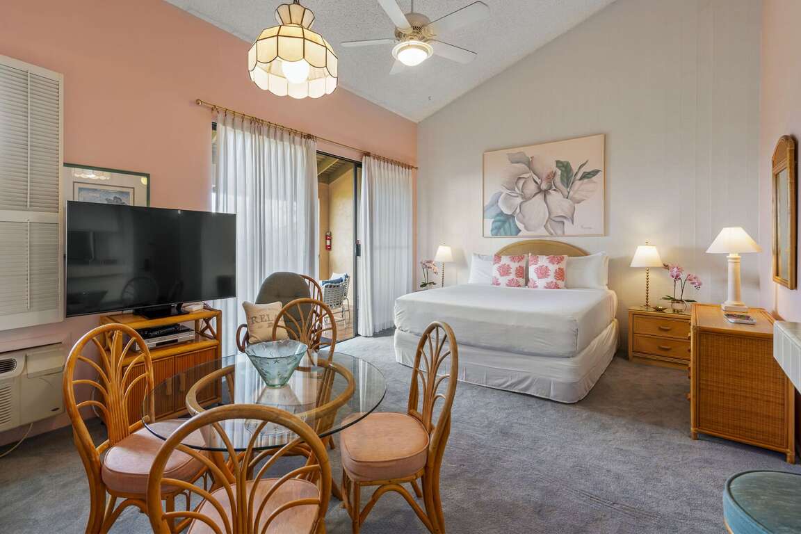 Inside, you’ll find a comfortable king-size bed, a fully equipped separate kitchen, and a private lanai with gorgeous ocean views—perfect for enjoying morning coffee or sunset drinks. The layout offers more space than a typical studio, making it ideal for longer stays or couples seeking comfort and functionality.