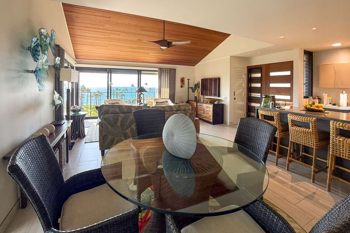 Inside, the fully renovated interior features a modern aesthetic with warm, natural tones and premium finishes. The updated kitchen is a chef’s dream, equipped with sleek quartz countertops, custom cabinetry, and high-end stainless steel appliances. Whether you're preparing fresh island cuisine or enjoying takeout from a local favorite, this kitchen elevates every meal with style and convenience.