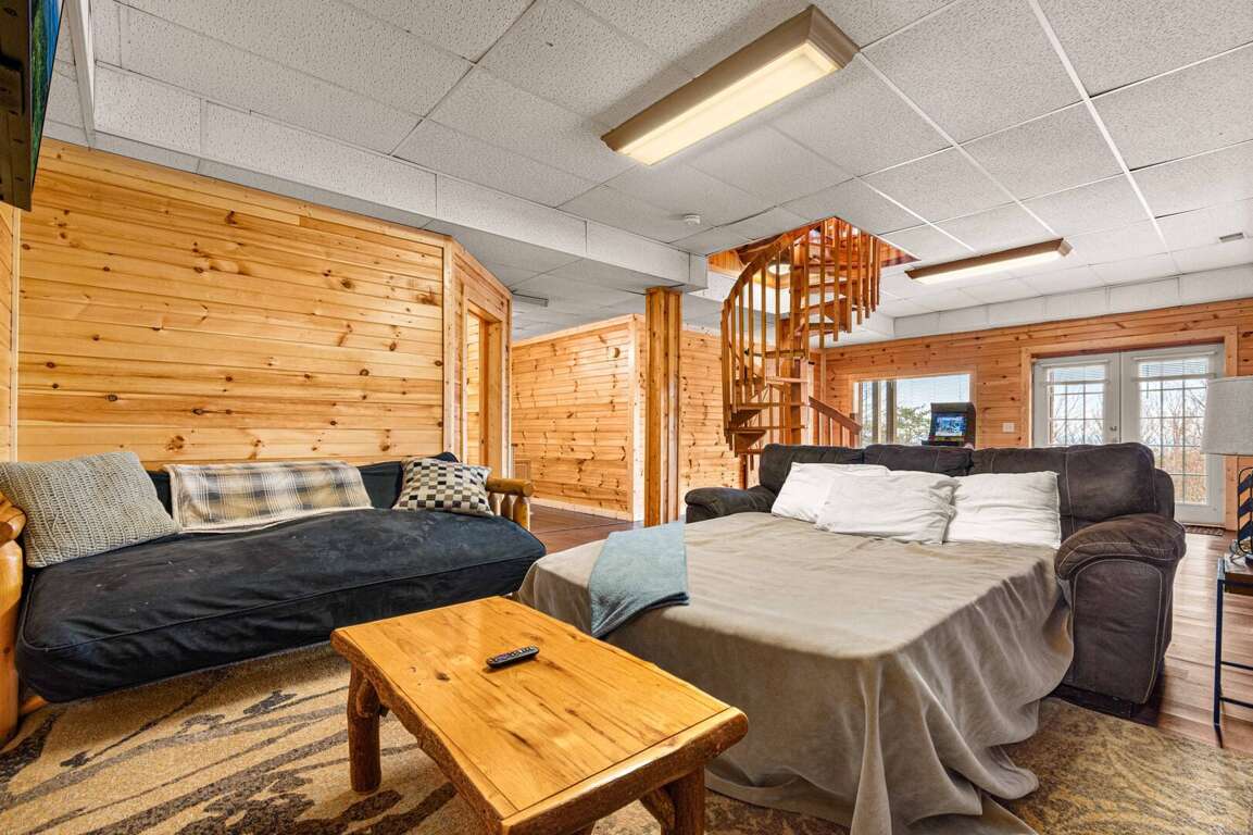 This stunning cabin is thoughtfully laid out with one bedroom on each floor, offering maximum privacy for couples or groups. The interior boasts soaring cathedral ceilings, classic wood-paneled walls, and a spiral staircase that connects the main social floor to the lower-level entertainment hub.