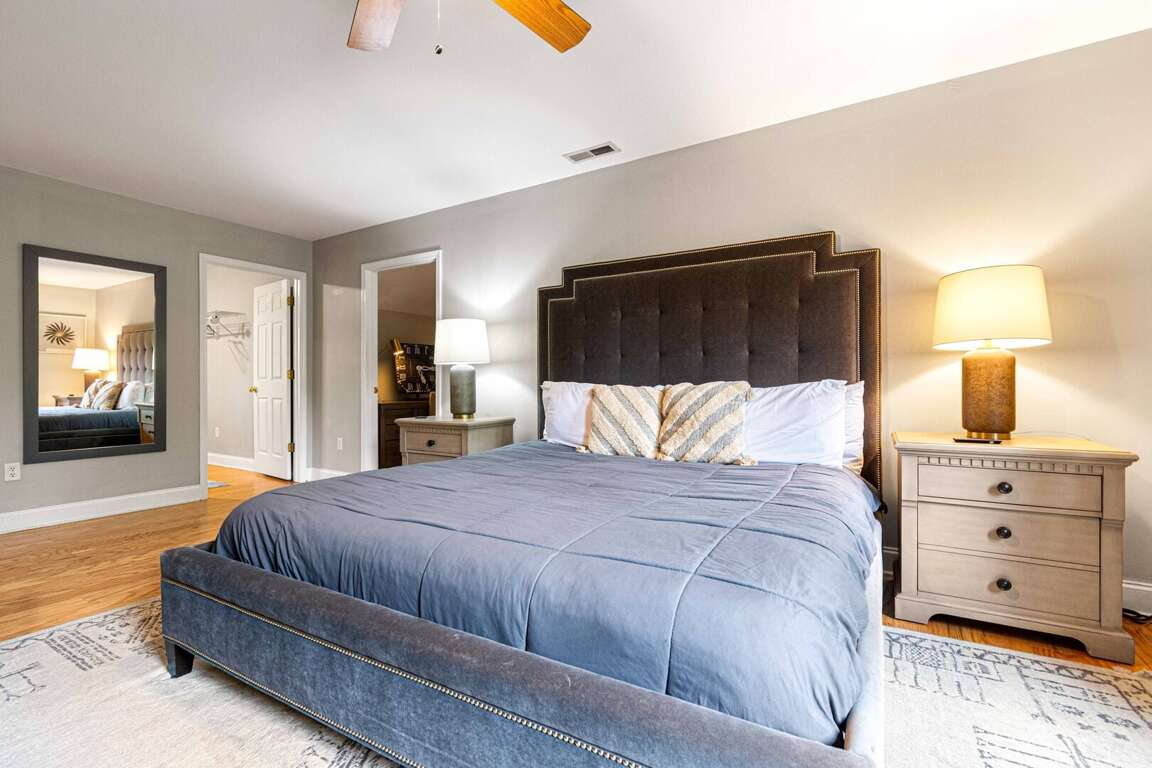 • Bedroom 2 (Upper Floor): King bed with smart TV, large closet, dresser, and private ensuite bathroom. (Sleeps 2)