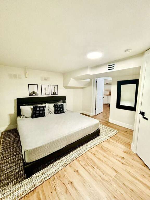 • Bedroom 2 (Downstairs King) - King bed with smart TV & dresser. Access to walk-in closet in the bathroom.