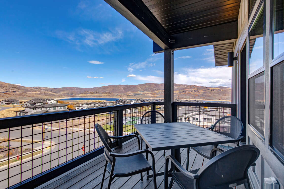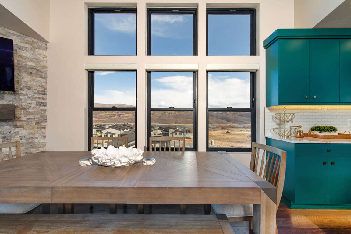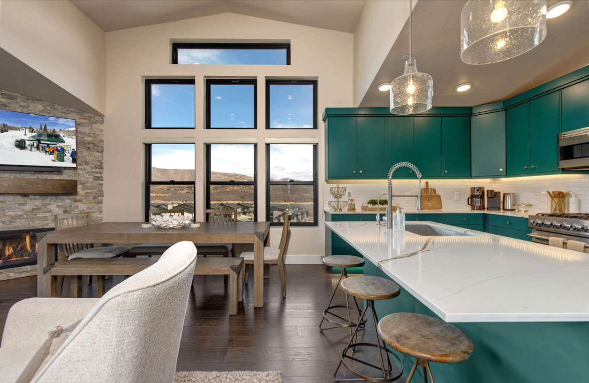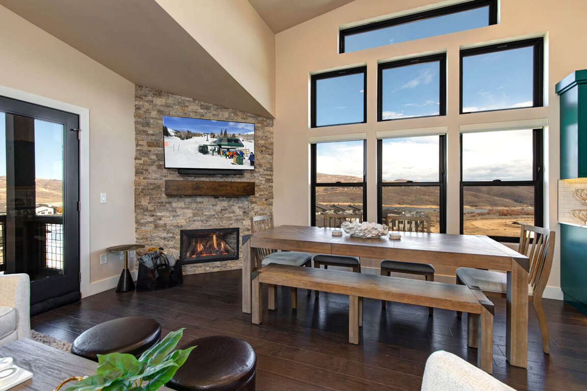 Polished and elegant with a sleek contemporary design, this top-floor unit offers a bright and inviting great room. A soaring vaulted ceiling and large windows with transoms overhead provide plenty of natural sunlight and showcase incredible views of the Jordanelle Reservoir and Deer Valley East Ski Mountain. Enjoy a cozy evening by the rugged stone fireplace or watch your favorite shows on the large HDTV. The natural wood dining table adds a rustic touch to this ultra-modern room.