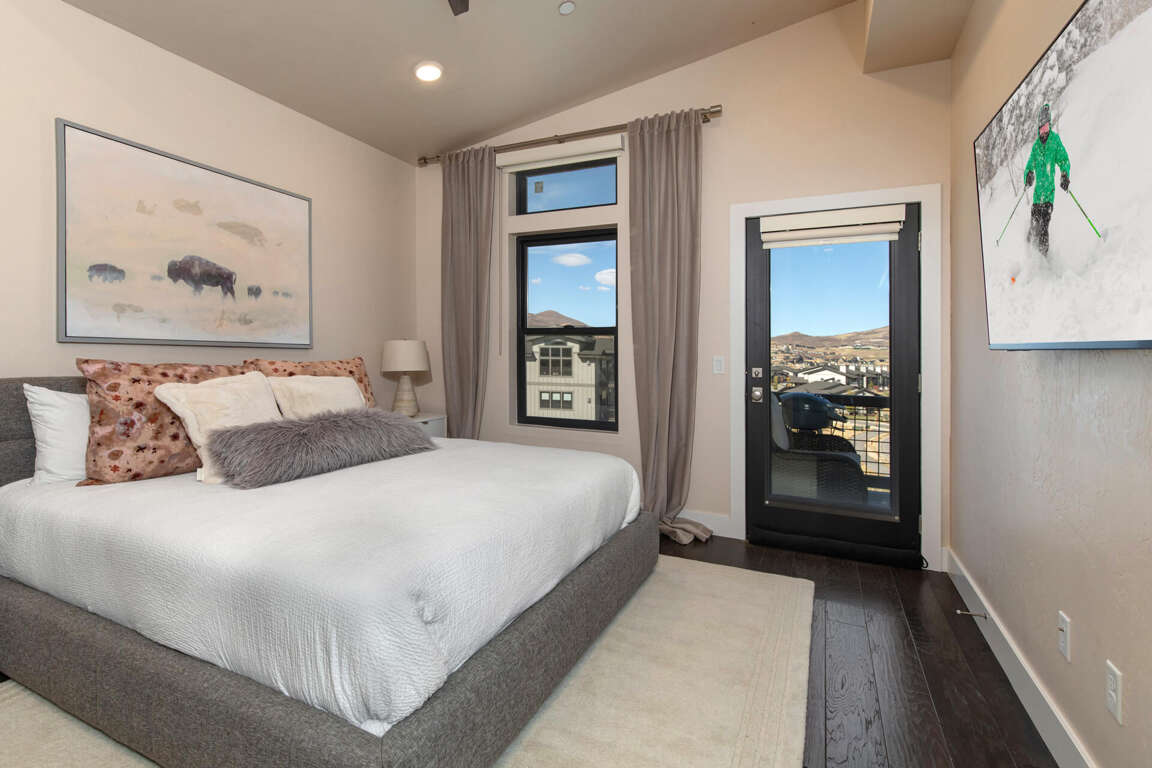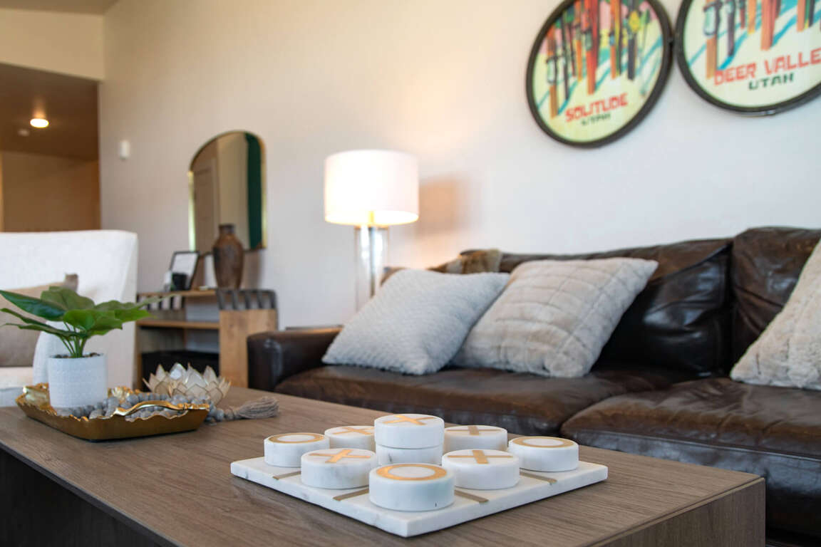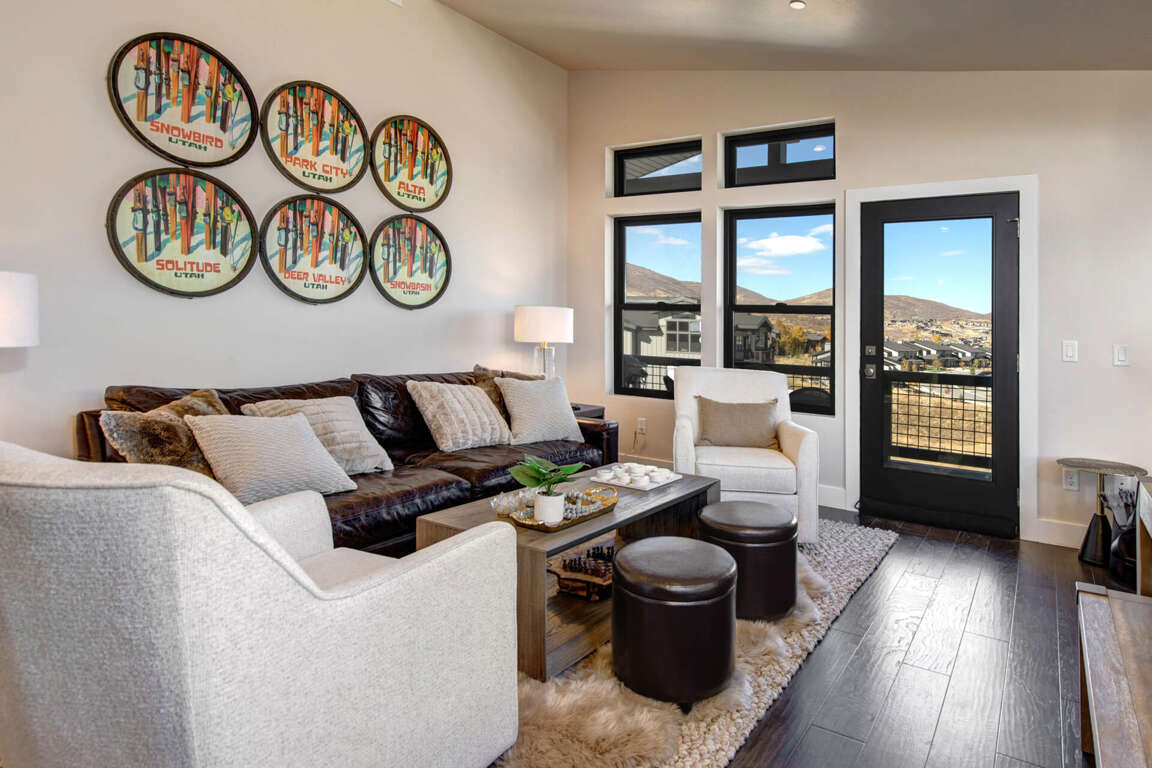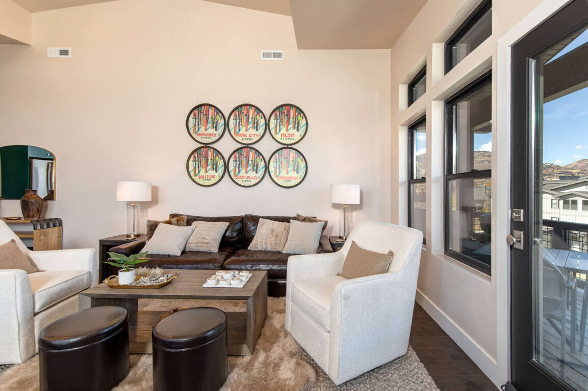 Polished and elegant with a sleek contemporary design, this top-floor unit offers a bright and inviting great room. A soaring vaulted ceiling and large windows with transoms overhead provide plenty of natural sunlight and showcase incredible views of the Jordanelle Reservoir and Deer Valley East Ski Mountain. Enjoy a cozy evening by the rugged stone fireplace or watch your favorite shows on the large HDTV. The natural wood dining table adds a rustic touch to this ultra-modern room.