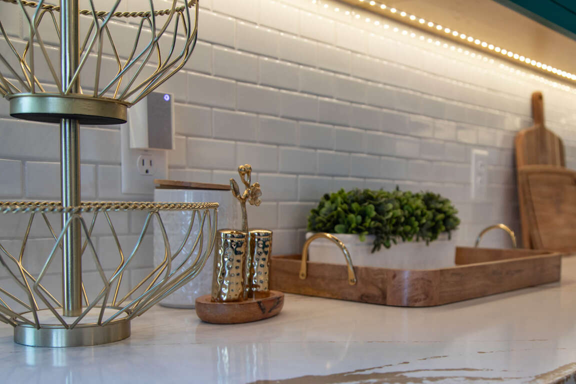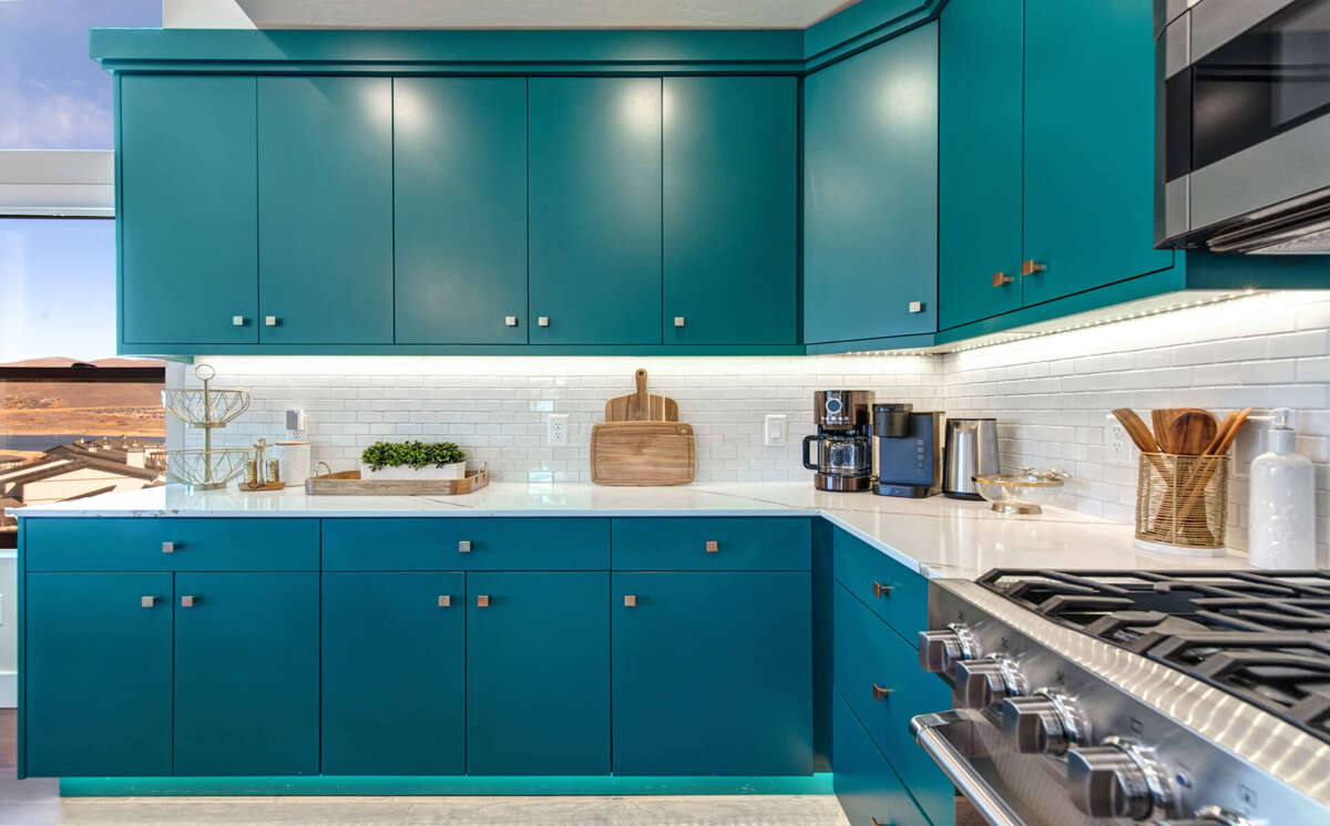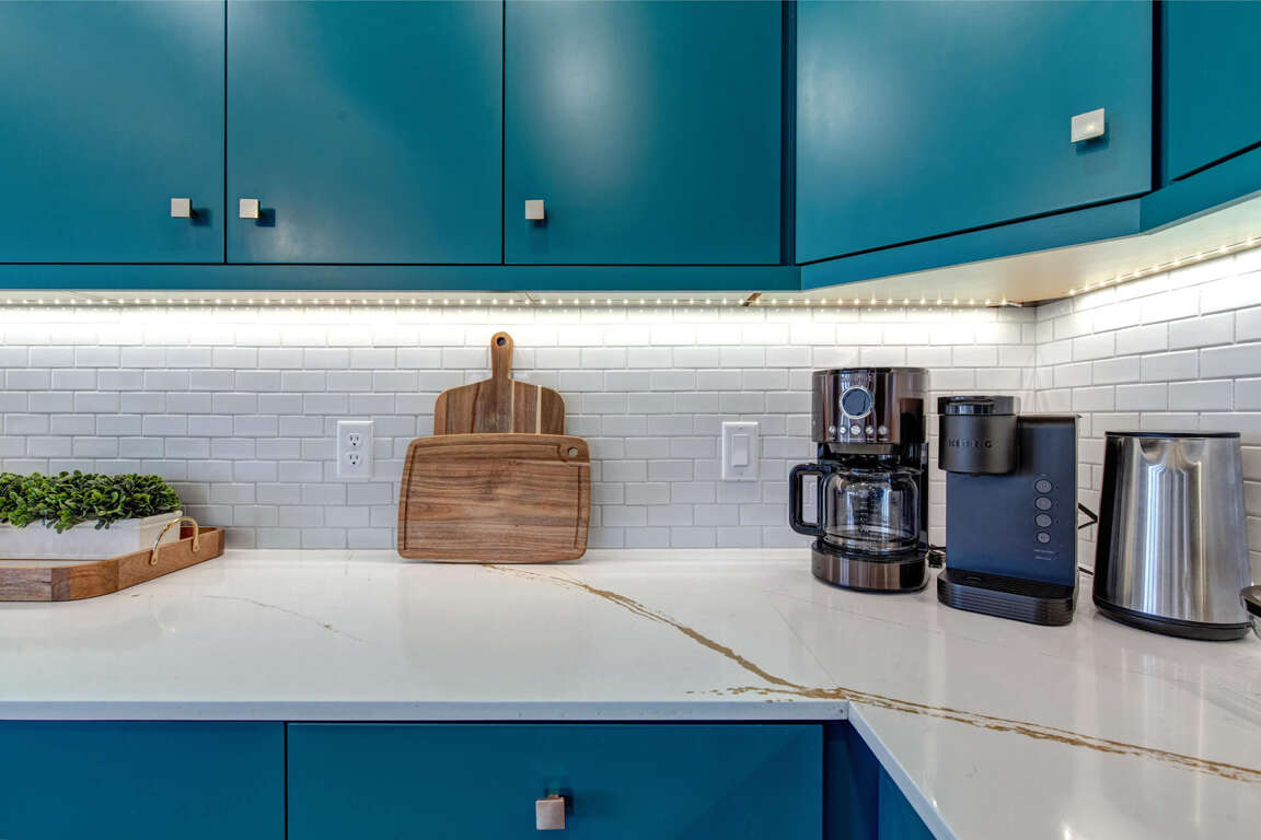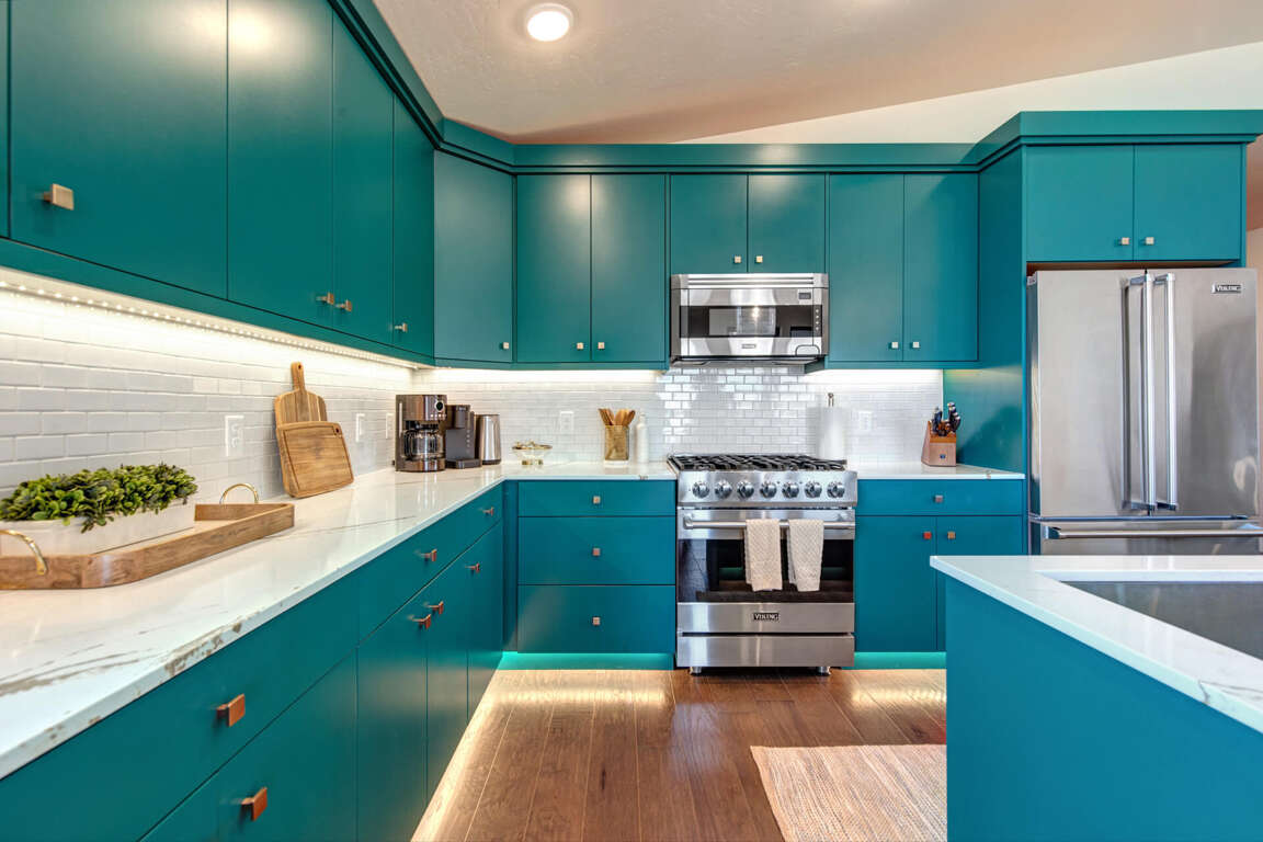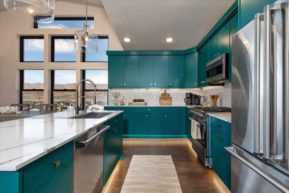 The open-concept kitchen features stunning aquamarine cabinetry and a center island with seating for three. It includes gleaming quartz countertops, an undermount sink, and a high-efficiency dishwasher. Premier appliances such as a dual-fuel 5 burner Wolf range, a mounted microwave, and a spacious refrigerator make cooking a breeze. The kitchen also boasts upgraded toe kick motion-sensored lights under the cabinets for night lighting. All VIKING appliances are complemented by a RO water system by the sink for easy access to drinking water.