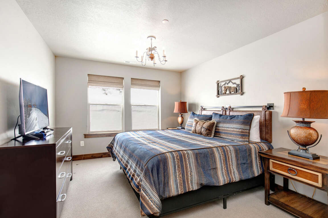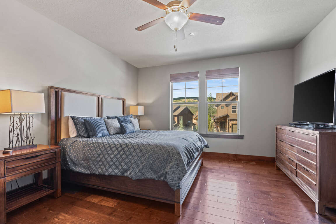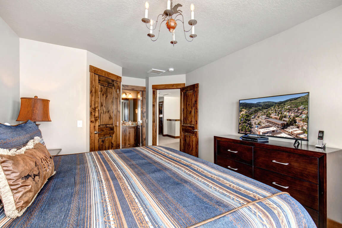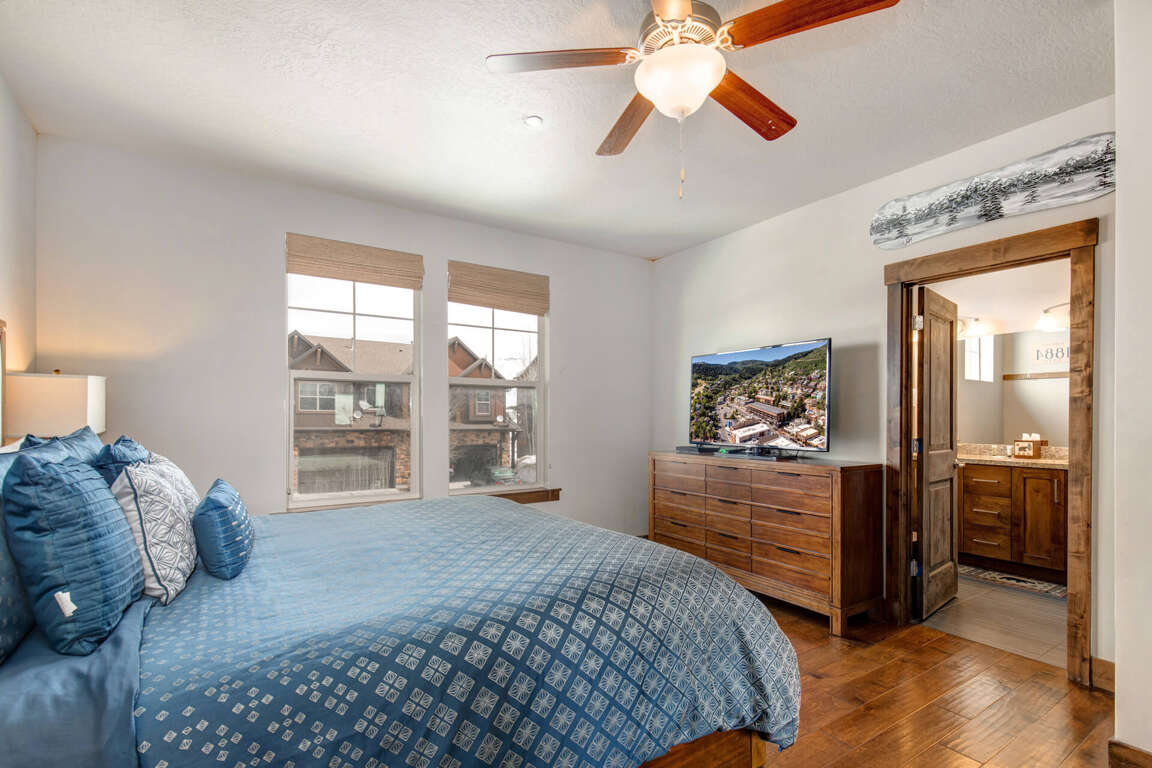 Primary Bedroom (Main Level): King-size bed with an ensuite bathroom.