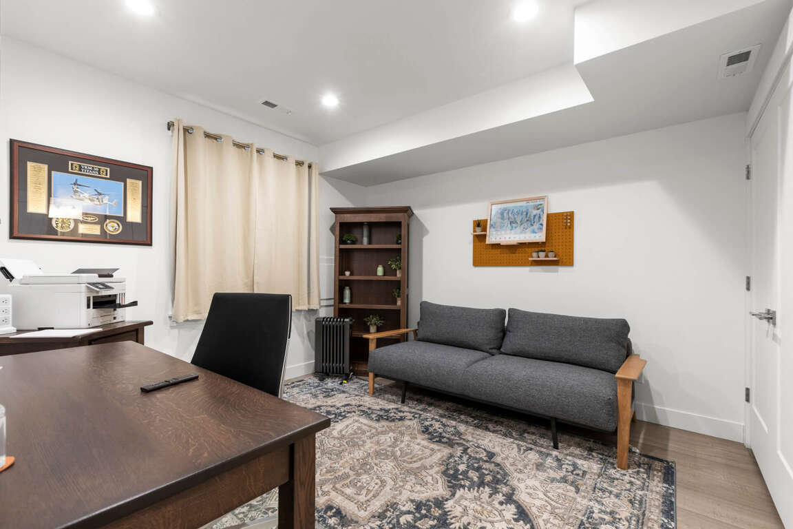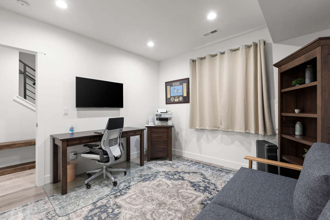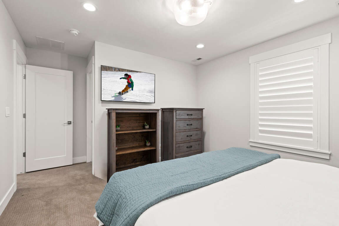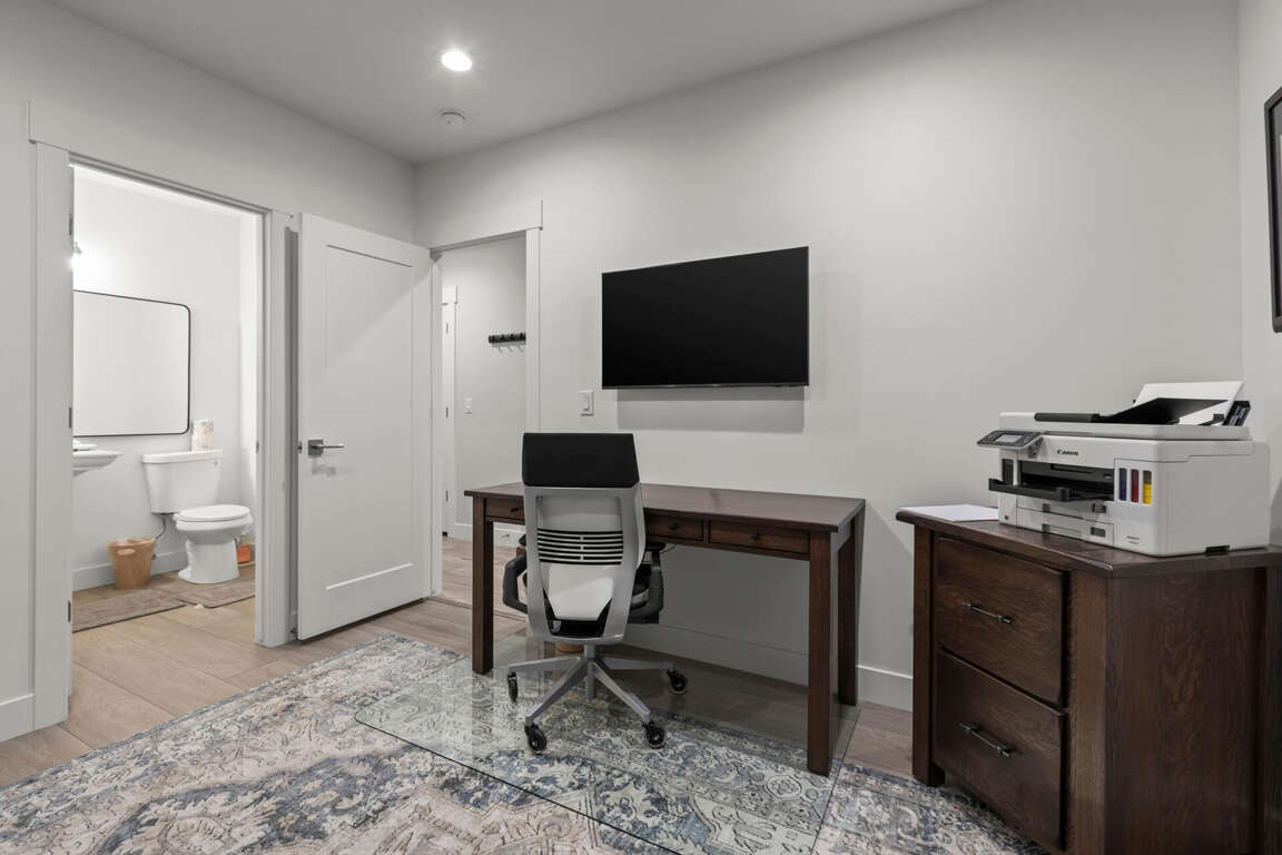 Office/Bedroom 3: Queen futon bed, perfect for additional guests, with half bathroom access and a 50" Samsung smart TV.