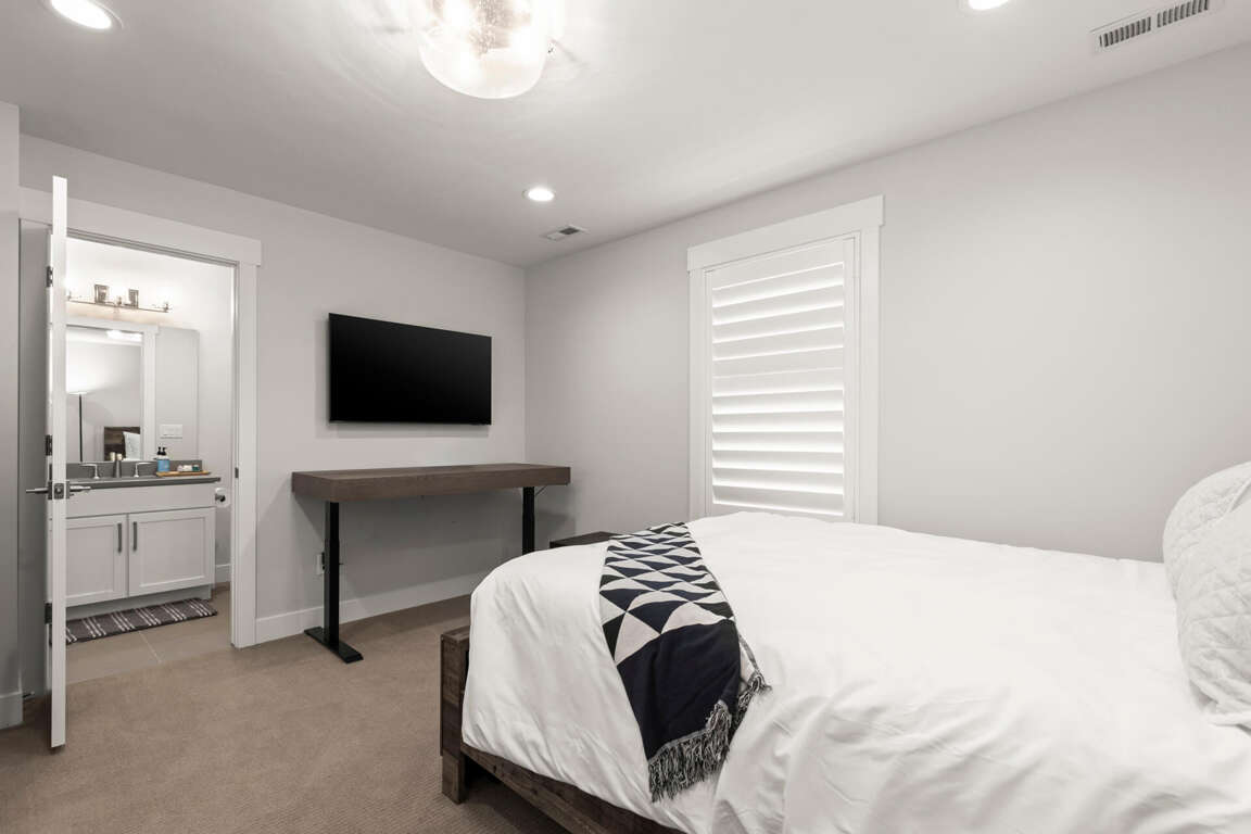 Bedroom 2: Queen bed with ensuite bathroom, ceiling fan, and a 50" Samsung smart TV.