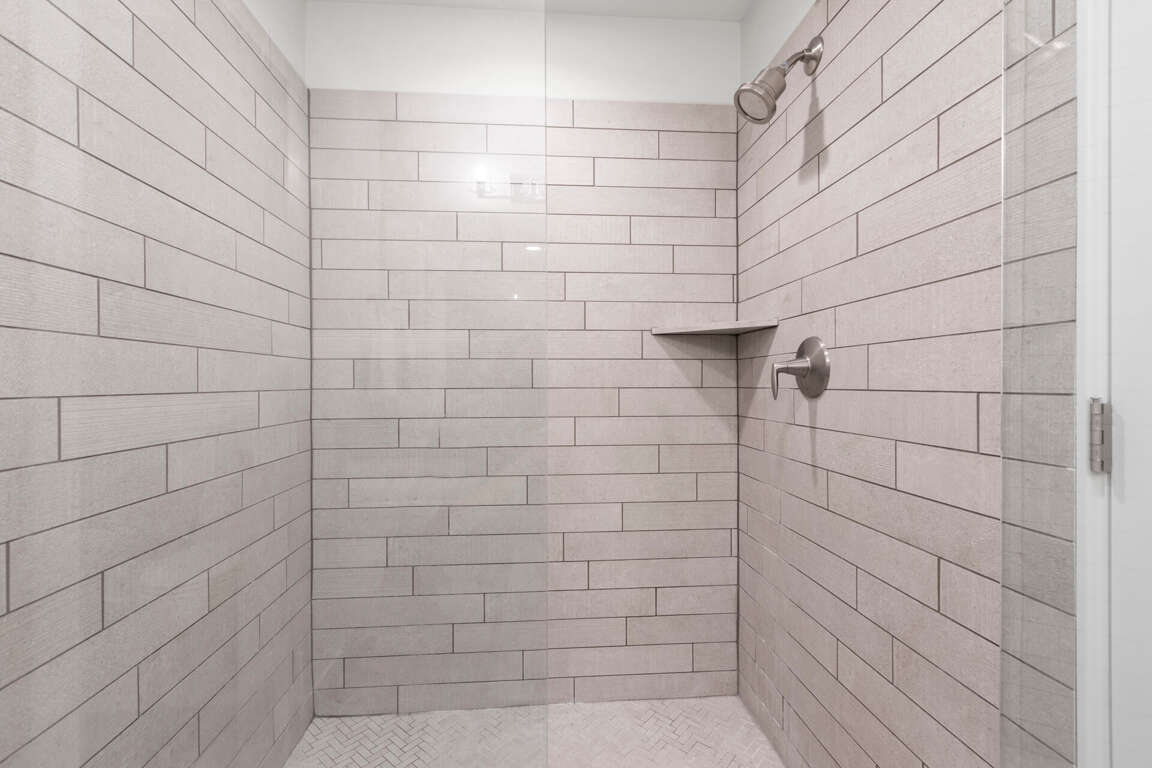 Primary Bedroom: King bed with an ensuite bathroom featuring a massive walk-in shower, ceiling fan, and a 50" Samsung smart TV.