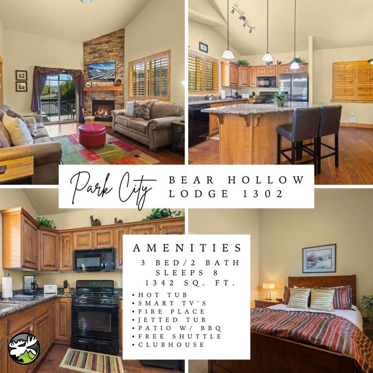 Bear Hollow Lodges 1302 is a high-end condo in Park City, UT, equipped with a fireplace, television, and dishwasher. Additional features include a hot tub, pool, grill, and internet access for a comfortable stay.