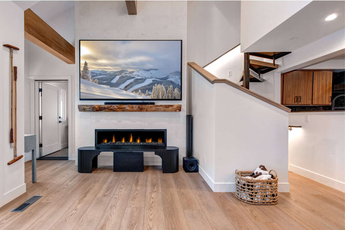 The living room features a cozy gas fireplace, creating a warm and inviting atmosphere perfect for relaxation. Enjoy entertainment on a stunning 100-inch Samsung TV, ideal for movie nights or watching your favorite shows in style.