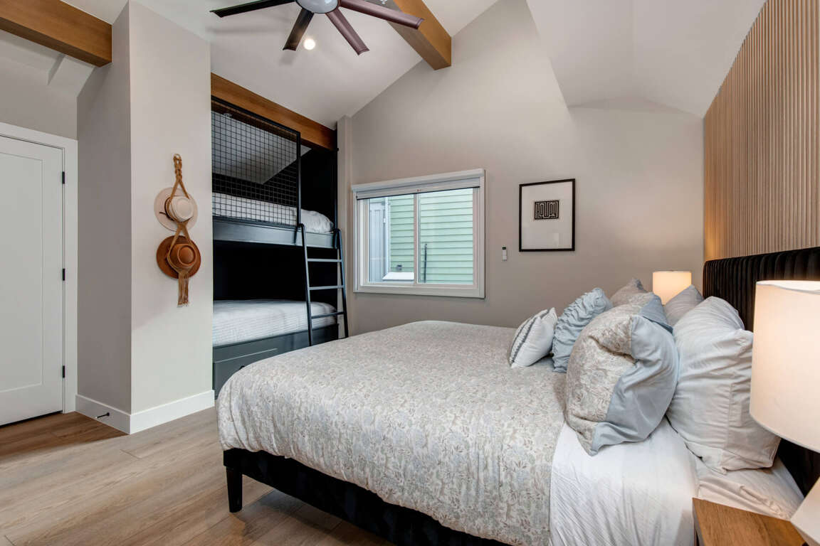 Downstairs Primary Bedroom: Features a king bed and a built-in bunk bed set with two twin over twin bunks. It includes a 55-inch smart TV and an ensuite bathroom, providing a cozy and private retreat.