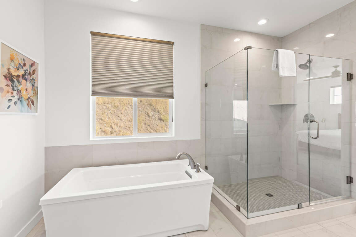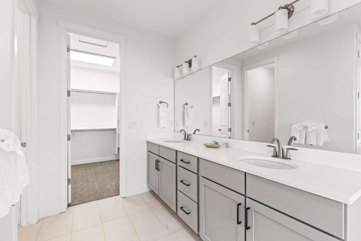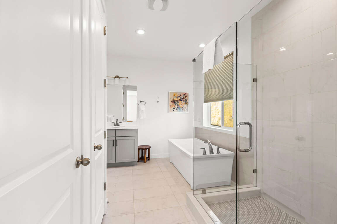 Bathroom 1: Located upstairs in the master suite, this luxurious bathroom offers a separate soaking tub, a glass/tile walk-in shower, and a dual sink vanity with a lighted mirror. It also includes a hair dryer and a walk-in closet with a sit-down makeup vanity, providing a spa-like experience.