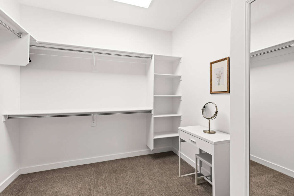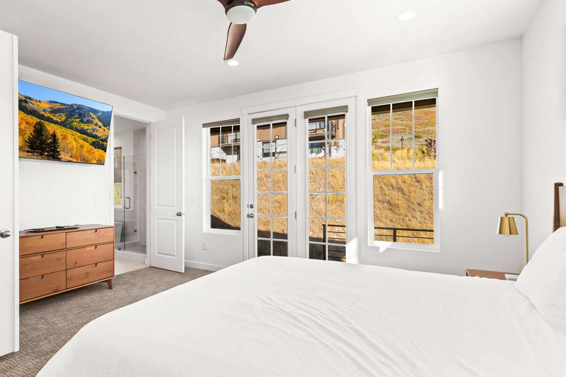 -Bedroom 3: King bed upstairs with a 65" LGE Smart TV, ensuite bathroom, patio, and ceiling fan. This master suite is a luxurious haven with a large walk-in closet featuring a small vanity and magnified mirror. The bedroom is furnished with 1 bench, 1 chest, 1 dresser, 1 desk/vanity with mirror and stool, and 2 bedside tables, offering both comfort and functionality.