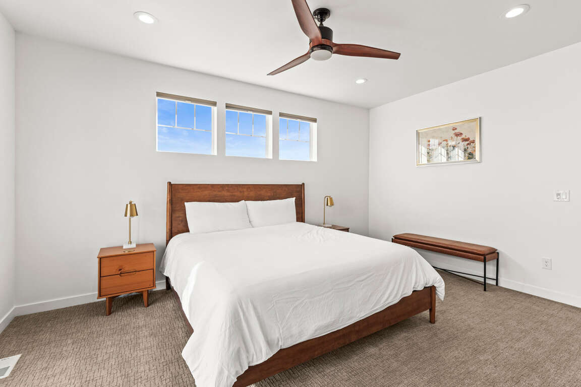 -Bedroom 1: King bed downstairs with a 55" Smart TV, ceiling fan, a small walk-in closet, 1 chest, 2 bedside tables, full-length mirror, and stool. This cozy space provides a serene retreat with all the comforts you need for a restful night's sleep.