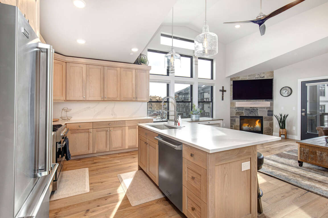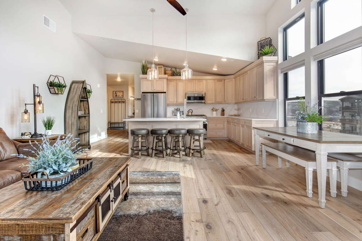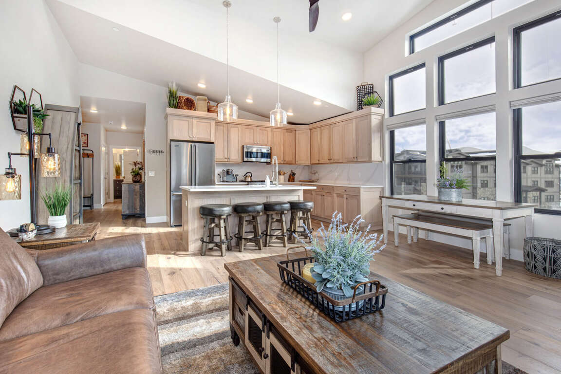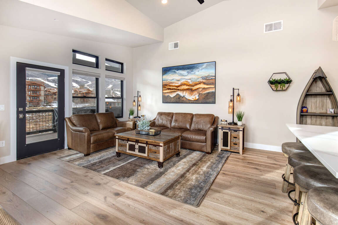 You can conveniently park in your assigned spot in the underground GARAGE and take the elevator up to your front door, which opens to reveal welcoming wide wood plank floors and cathedral ceilings. The GREAT ROOM is a wide-open space that allows for easy socializing, with an inviting LIVING AREA that has a spacious leather sofa and love seat, a corner fireplace with stone detail, and a large Smart HDTV. Huge windows with transoms allow plenty of natural light to flow inside and frame the mountain views perfectly. Theres also a glass door that leads out to your private patio area, where youll find an electric grill for cooking up some delicious burgers.