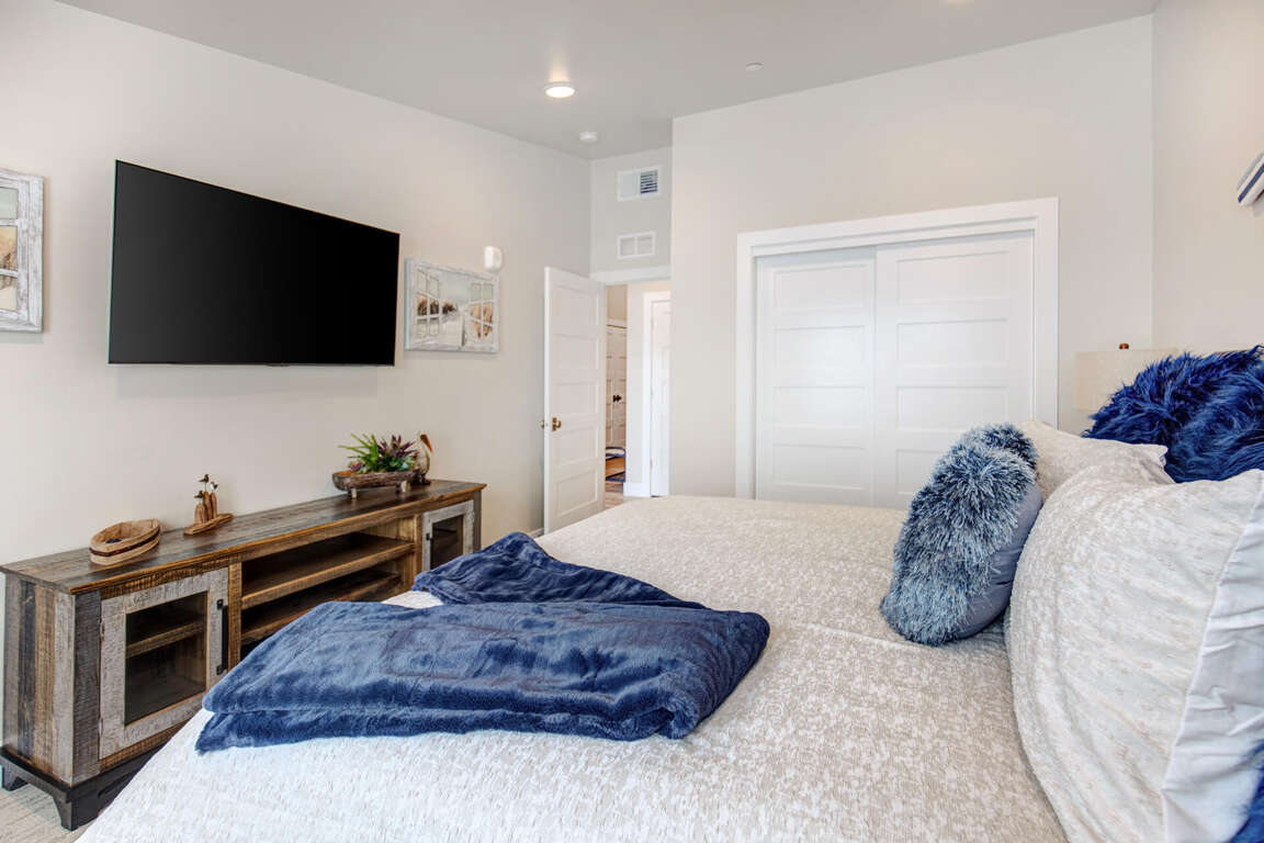 Down the hallway lies the PREMIER BEDROOM SUITE, complete with a sumptuous king-size bed, balcony access, a large walk-in closet, and a lovely ENSUITE BATHROOM, a double vanity, and a glass-door step-in shower. The SECOND GUEST BEDROOM includes a king-size bed, and the THIRD GUEST BEDROOM features a twin-over-queen bunk bed, a Smart HDTV, and an extra-large Luvsac. Theres also another FULL BATHROOM with a tub/shower combo that can be accessed from the hallway.