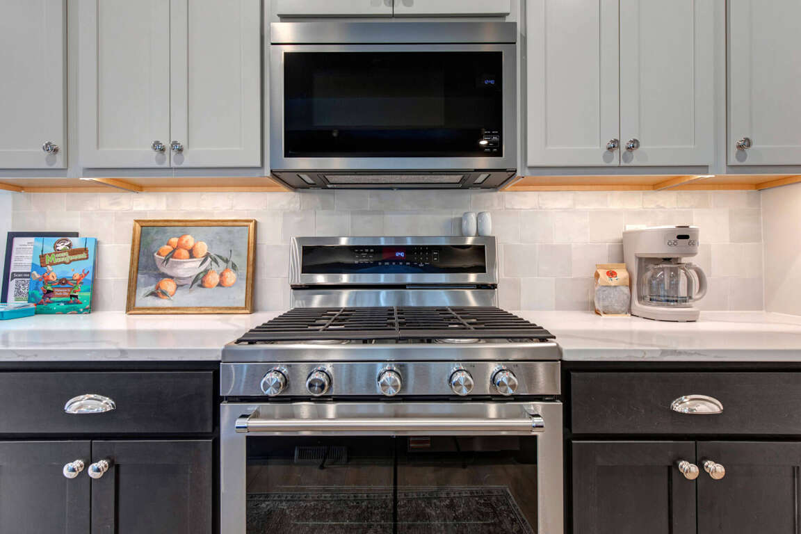 Our fully equipped kitchen is a chef's dream, featuring high-end stainless steel appliances and all the essentials needed to prepare delicious meals. From cookware to a crockpot, corkscrew, and more, you'll find everything you need to whip up culinary delights. The kitchen also includes a coffee maker, toaster, and blender, catering to all your morning and evening needs. Savor your meals at the elegant dining table, which seats 8, or grab a quick bite at the bar, which offers additional seating for 4. The open layout ensures that cooking and dining remain communal activities, allowing everyone to participate and enjoy.