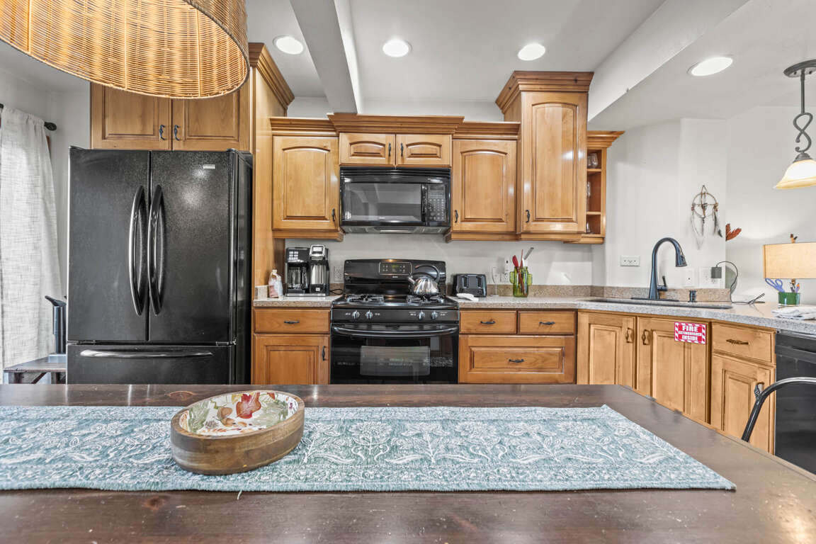The kitchen is thoughtfully stocked with everything you need to prepare meals during your stay, from breakfast to dinner. Whether you're making a quick snack or a full meal, you'll find cookware, utensils, and appliances ready for your culinary creations, including a crockpot, blender, and a full set of pots and pans. The dining area comfortably seats eight at the kitchen table, with three additional bar stools at the counter, providing ample space for family meals or intimate gatherings. The area is complemented by a coffee table and side tables, adding to the functionality and style.