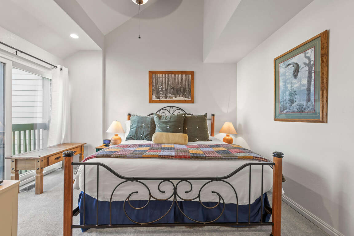 Retreat to the tranquil bedrooms, each designed to offer a restful escape. The primary bedroom boasts vaulted ceilings, a king bed, ceiling fan, and a gas fireplace, creating a luxurious and cozy atmosphere. It also connects to its own private patio, allowing you to enjoy fresh air and stunning views at any time. The ensuite bathroom features a walk-in shower, providing a spa-like experience. The guest bedroom is equipped with a king bed, ceiling fan, TV, and a sliding glass door that opens to a small patio with a railing, allowing you to let in fresh air and enjoy the surroundings. The third bedroom features a twin over full bunk bed, a TV, and a desk, making it an excellent choice for families with children, groups of friends, or those needing a workspace.