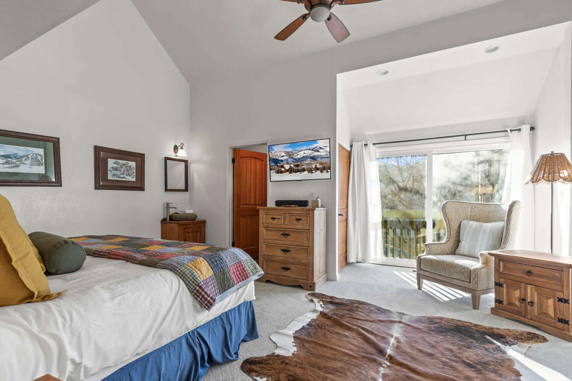 Primary Bedroom: King bed, vaulted ceilings, ceiling fan, TV, gas fireplace, and exclusive patio access with a walk-in shower in the ensuite bathroom