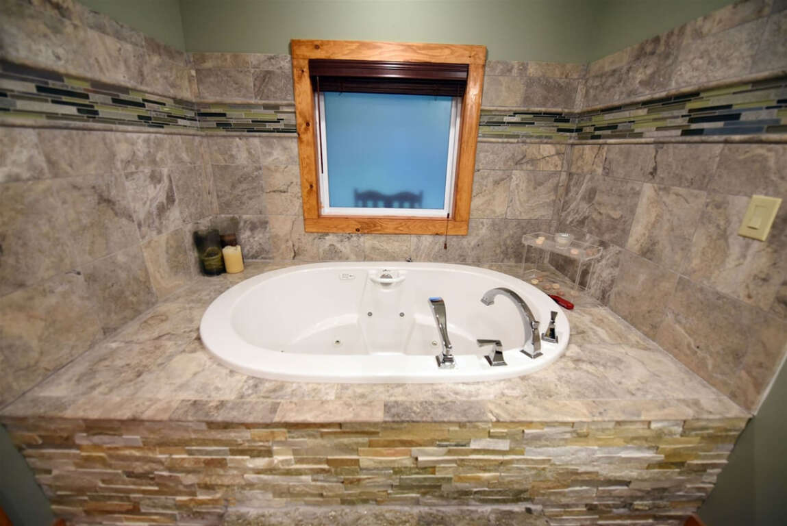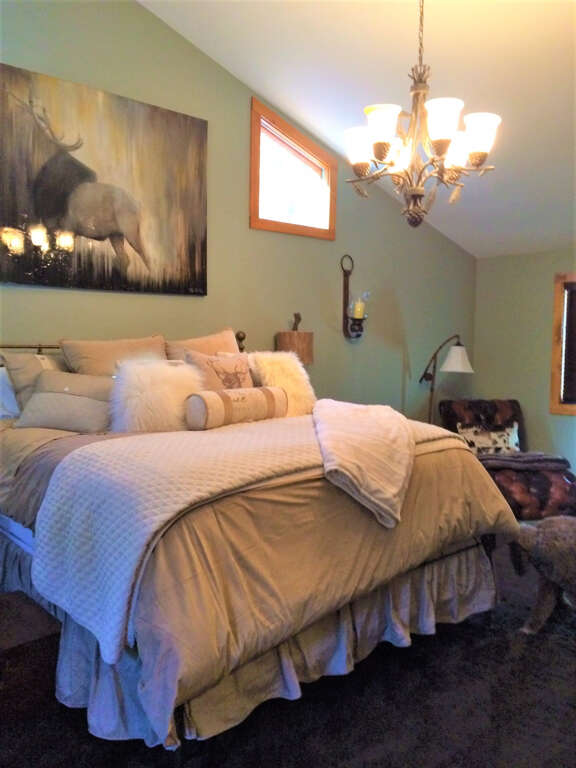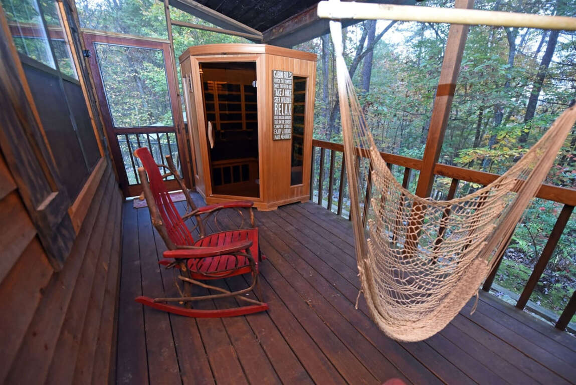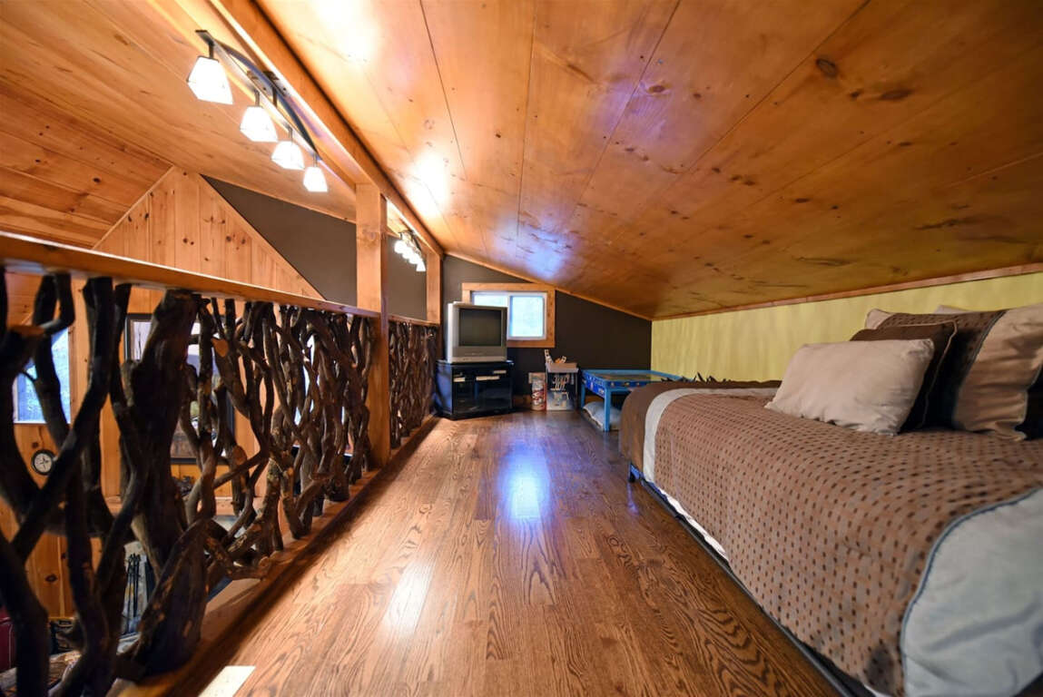 The living room is the heart of the cabin, boasting a wood-burning fireplace that sets the mood for cozy nights spent snuggled up on plush sofas. Stay connected with complimentary Wi-Fi and satellite TV, or step outside to the deck to unwind in the hot tub while taking in breathtaking views of the surrounding nature. For added relaxation, indulge in the sauna or gather around the outdoor fire pit to roast marshmallows under a starry sky.